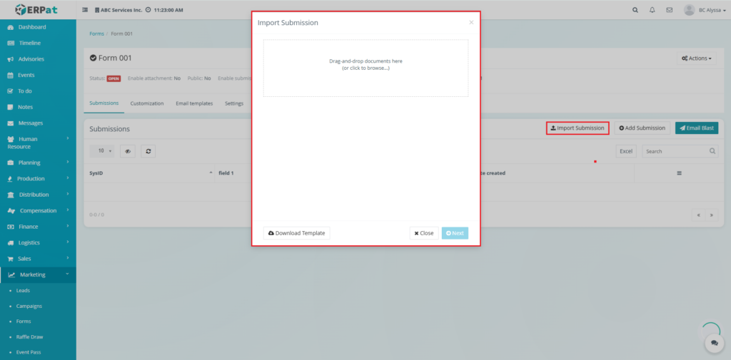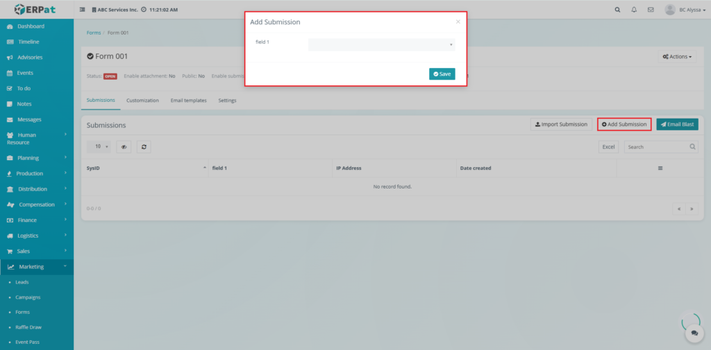 - In the Add Submission modal, fill in the required fields (e.g., field 1).