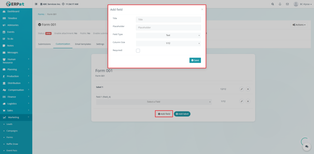 - Column Size: Choose the layout width for the field (e.g., 1/12).