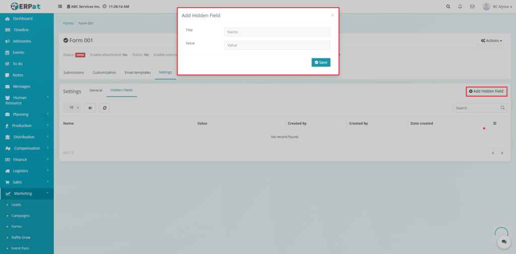 - Field List: Displays the Name, Value, Created by, and Date created for all existing hidden fields.