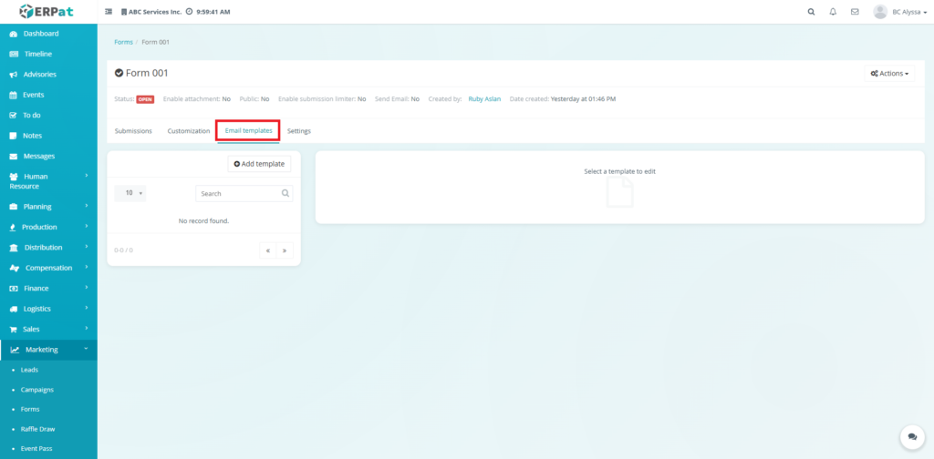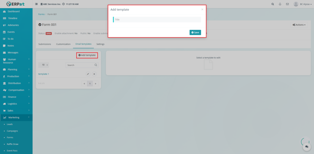 - Once saved, select the template from the list to edit its specific content in the workspace provided.