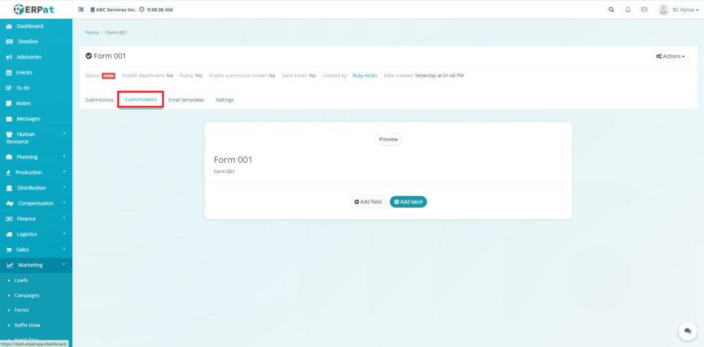 - Add Label: Enables the addition of descriptive text or headers within the form layout.