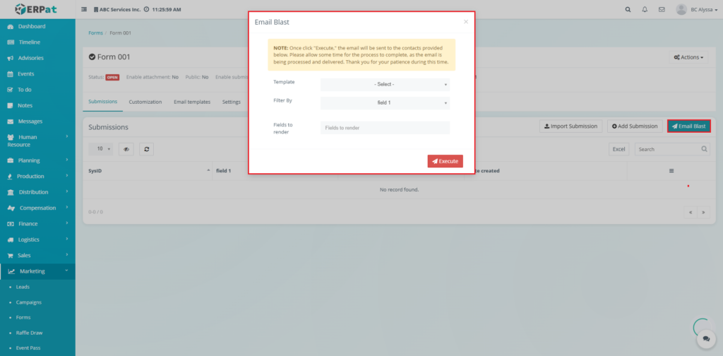 Note: Once “Execute” is clicked, the email will be sent to the contacts. Please allow time for the system to process and deliver the messages.