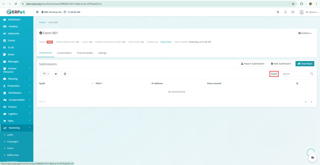 - Click the button to automatically generate and download an Excel spreadsheet containing all current submission records.