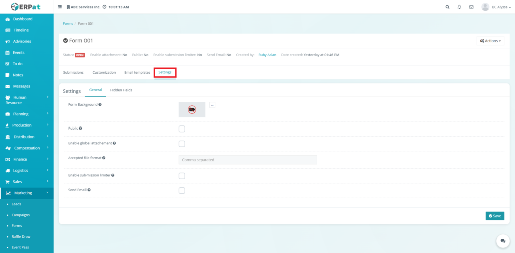 - Select the Settings tab and then click the Hidden Fields sub-tab.