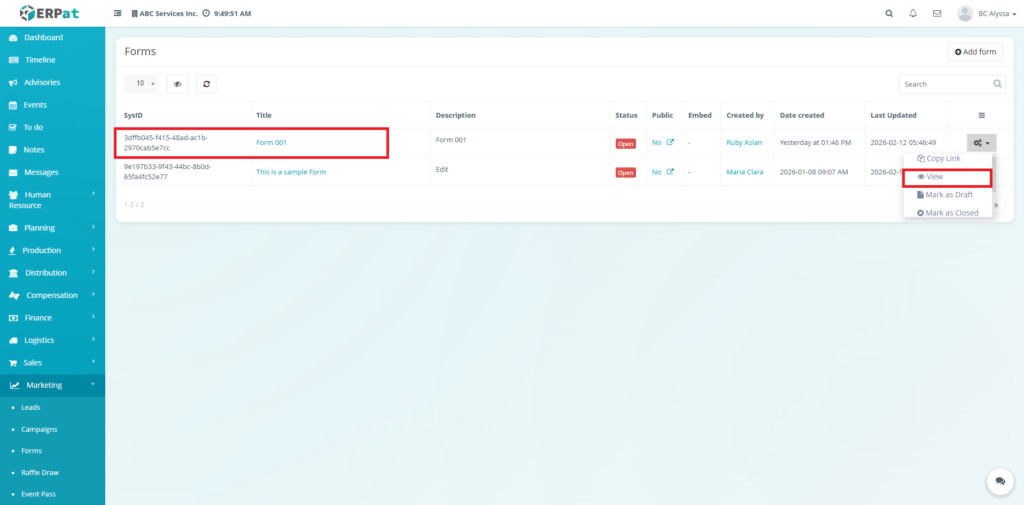 - Click the Title of the form (e.g., “Form 001”) or select View from the Actions menu.
