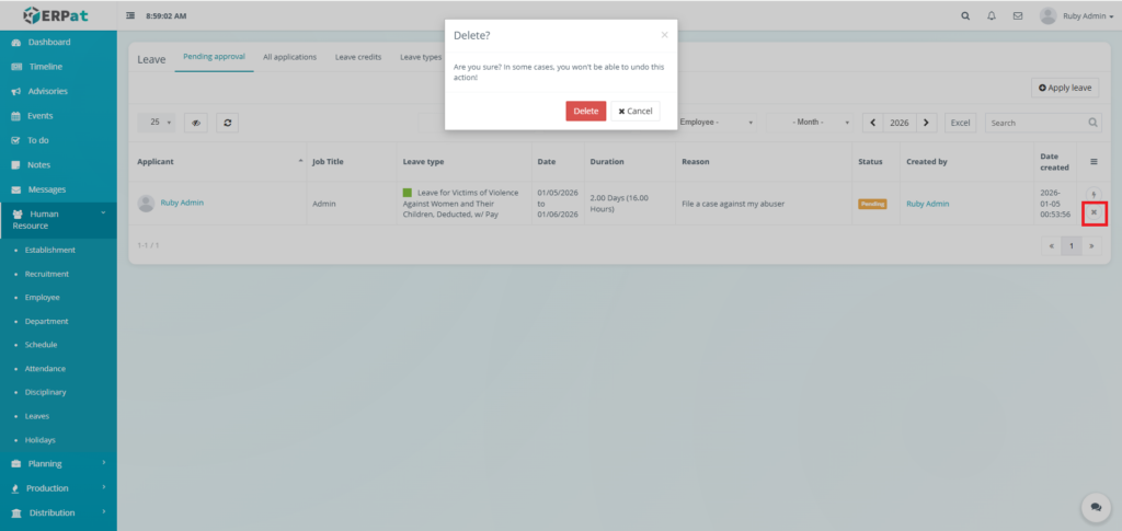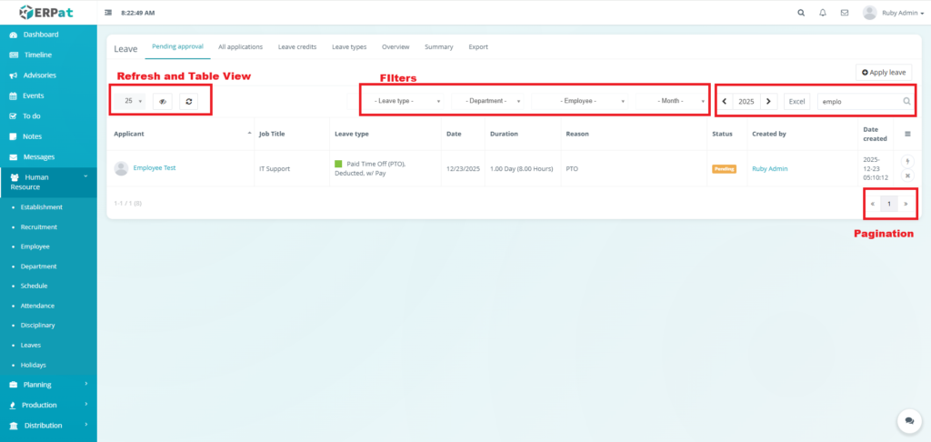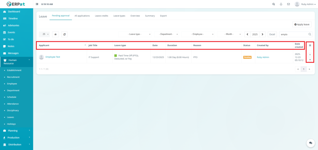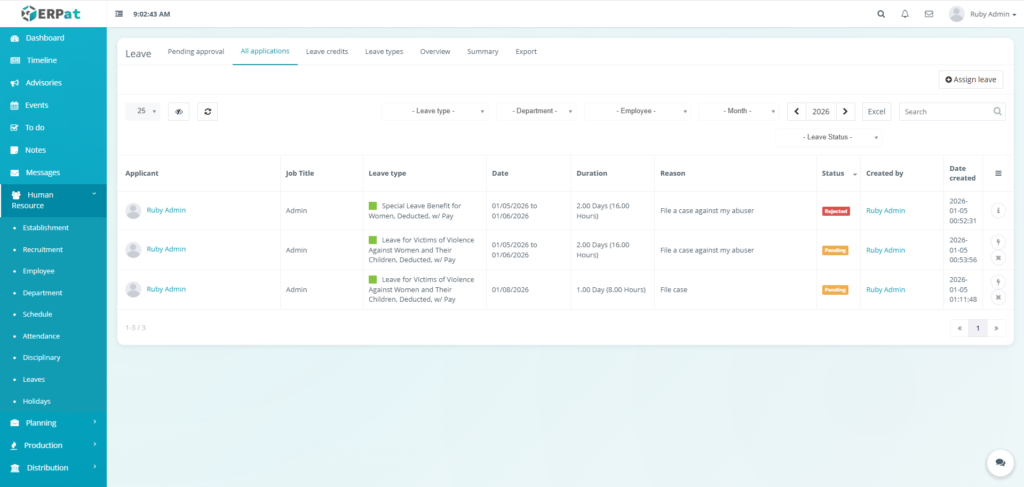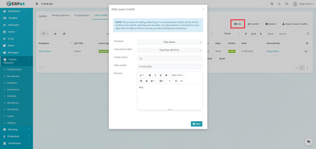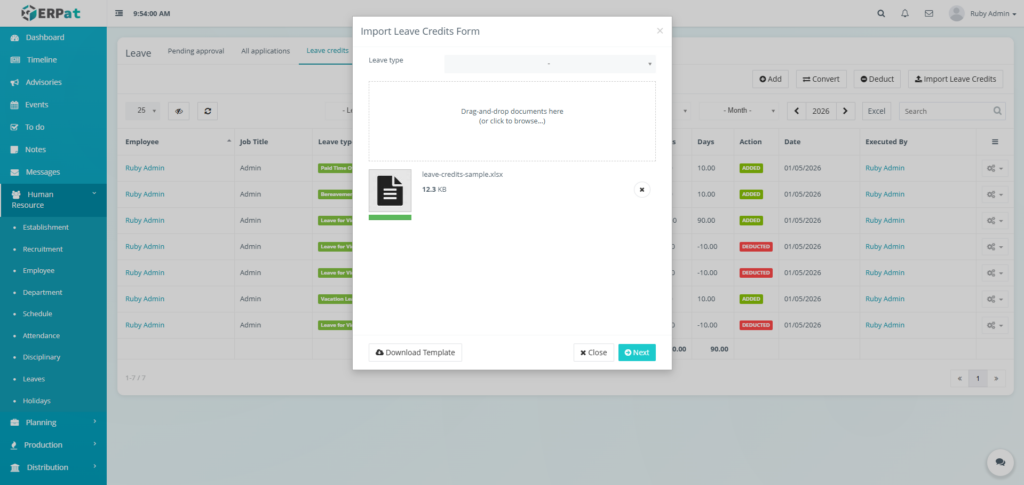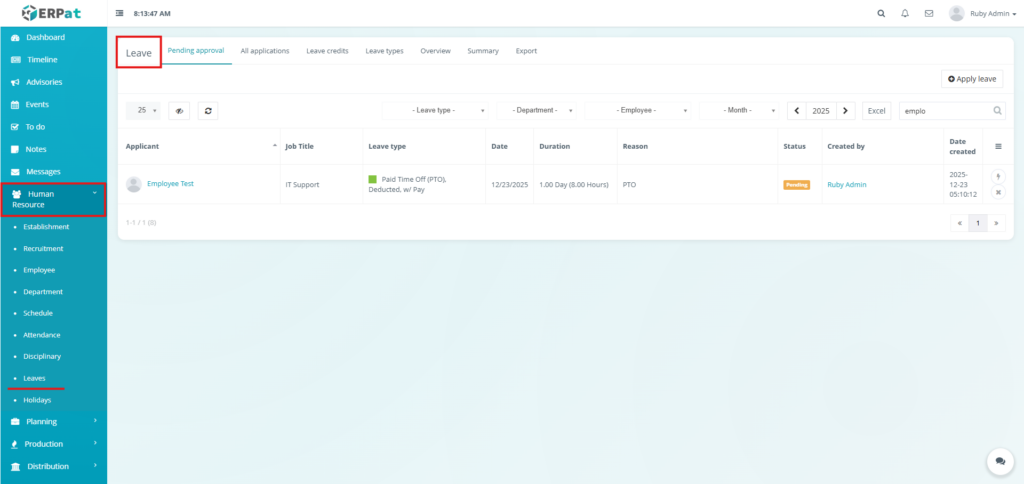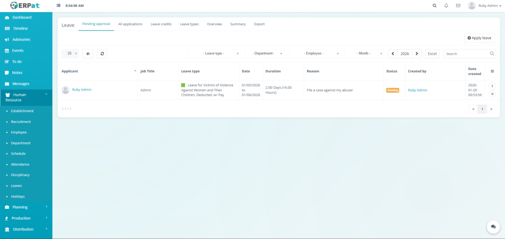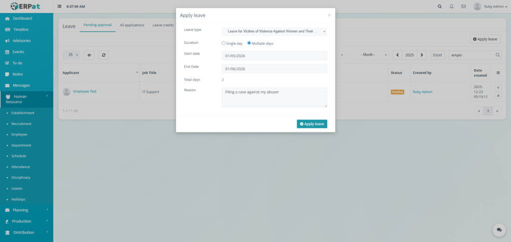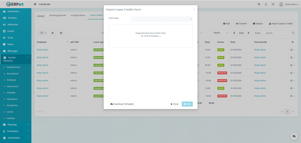 The Leave Module is used to manage employee leave applications, approvals, leave credits, and leave types within the ERPat System. It enables employees to request leave while allowing HR and administrators to monitor balances, approvals, and compliance with company policies.