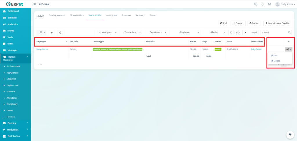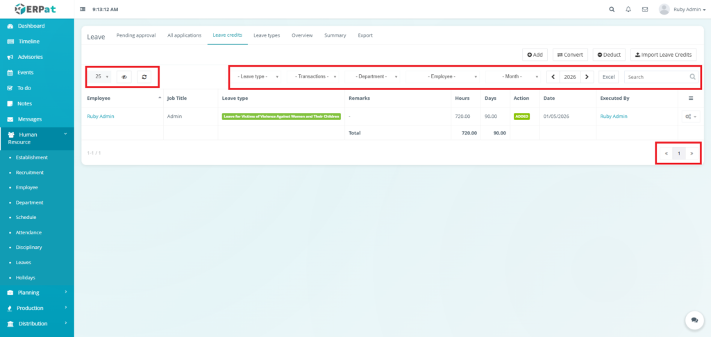 The Leave Credits listing page provides an overview of leave credit balances and transactions with the following columns: