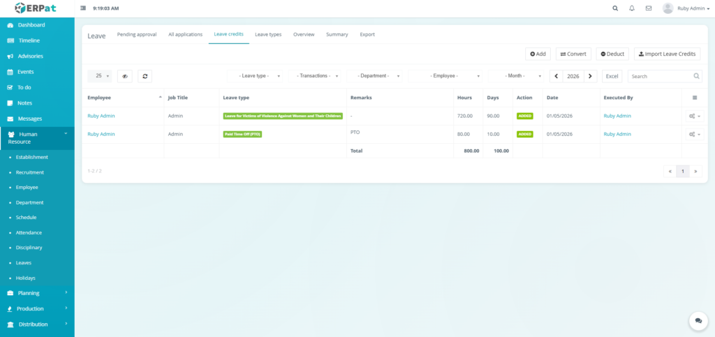All leave-related actions (application, approval, credit adjustment) are logged for audit and compliance purposes within the ERPat System.
