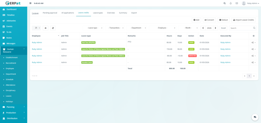 - HR Admin and authorized roles can approve, reject, and manage leave credits.