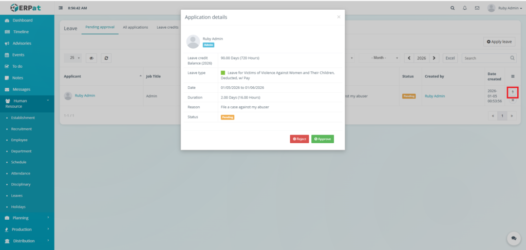 - Click the Reject or Approve button to Approve or Reject the leave application.