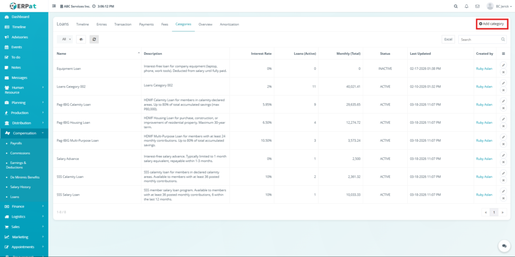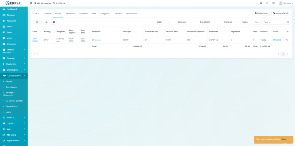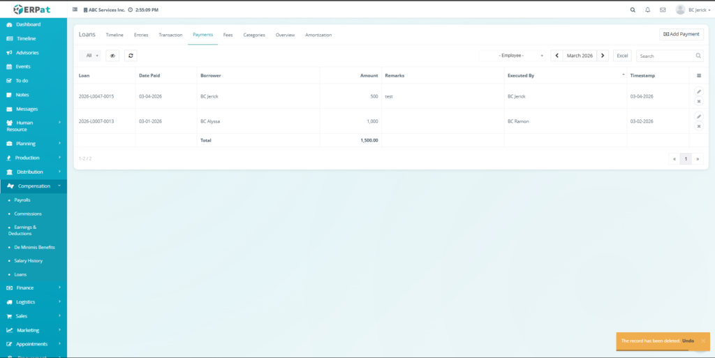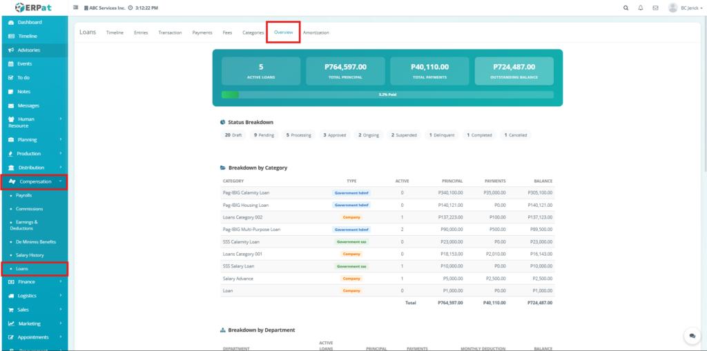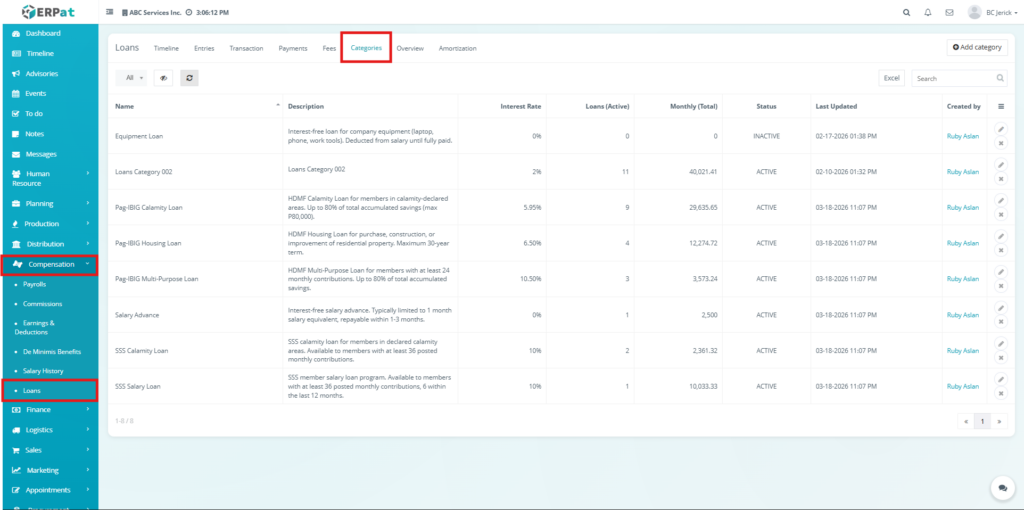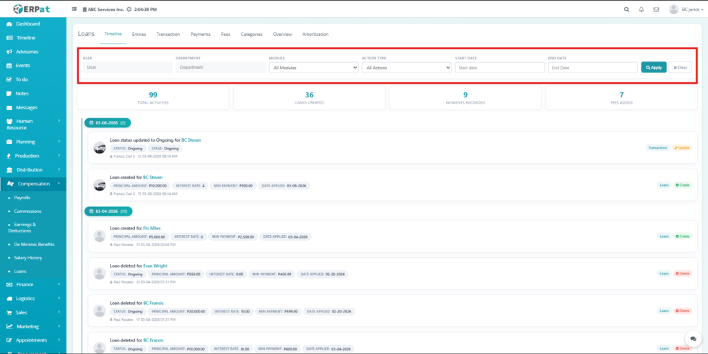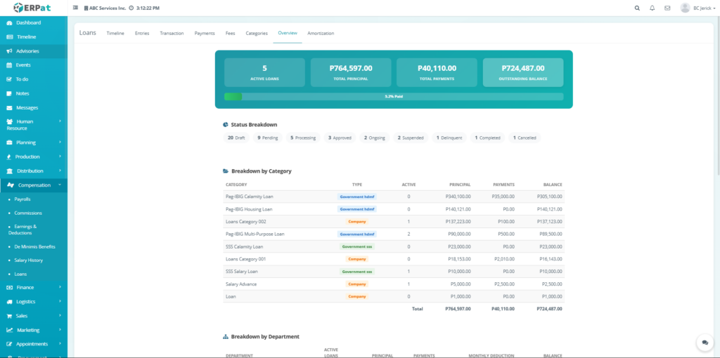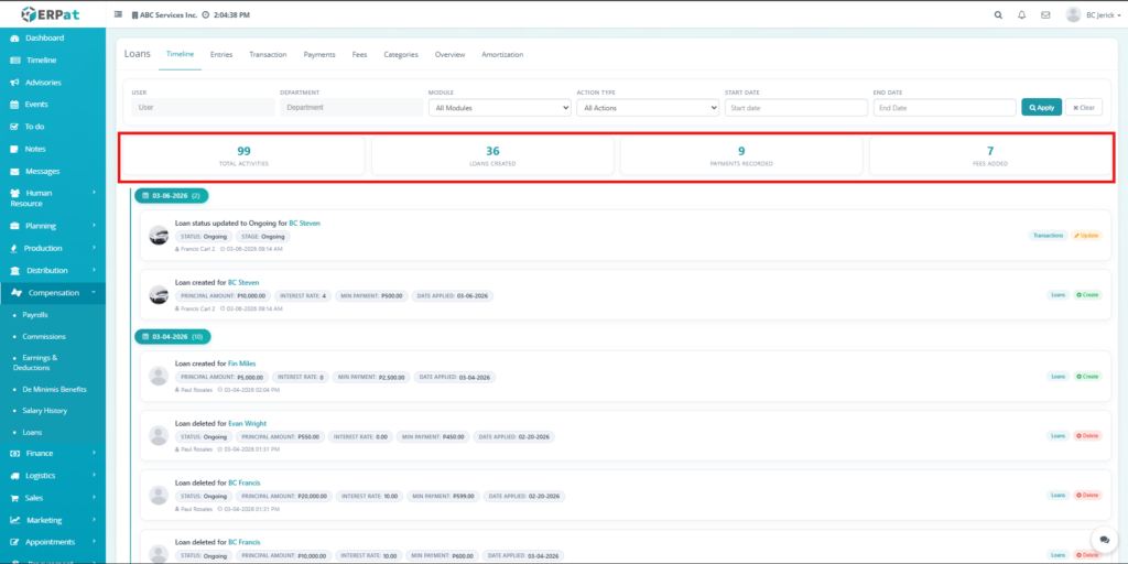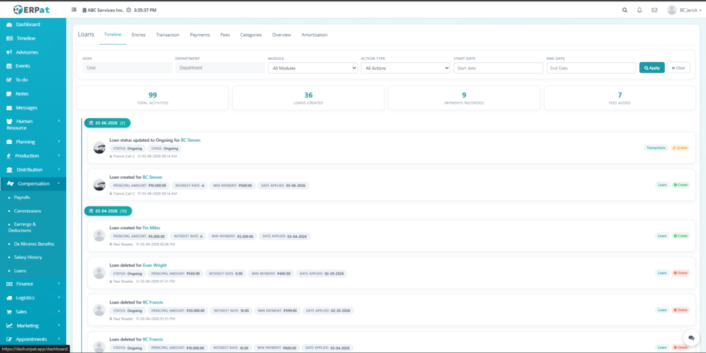The Loan Module in the ERPat system is used to manage, track, and monitor employee loans within the organization. It provides a complete solution for handling loan creation, repayment tracking, categorization, and reporting.
