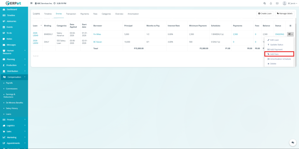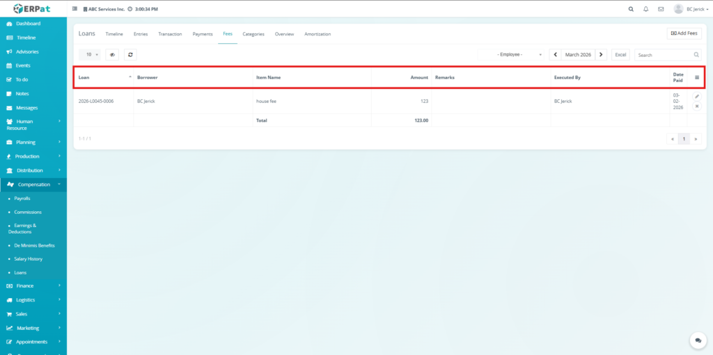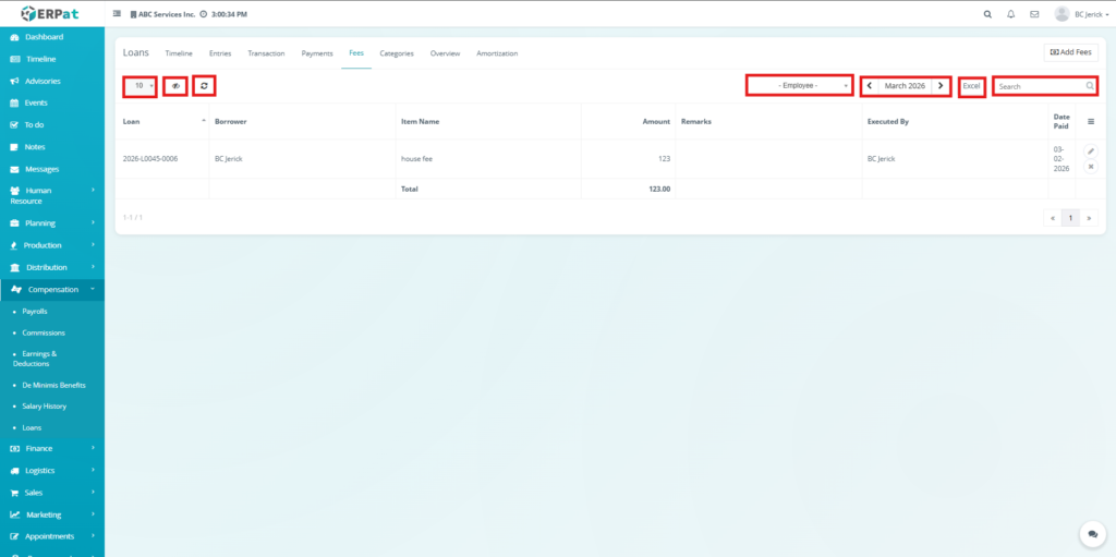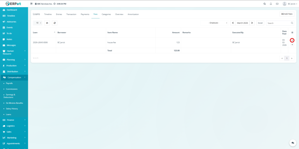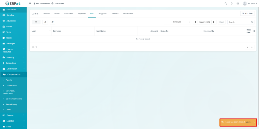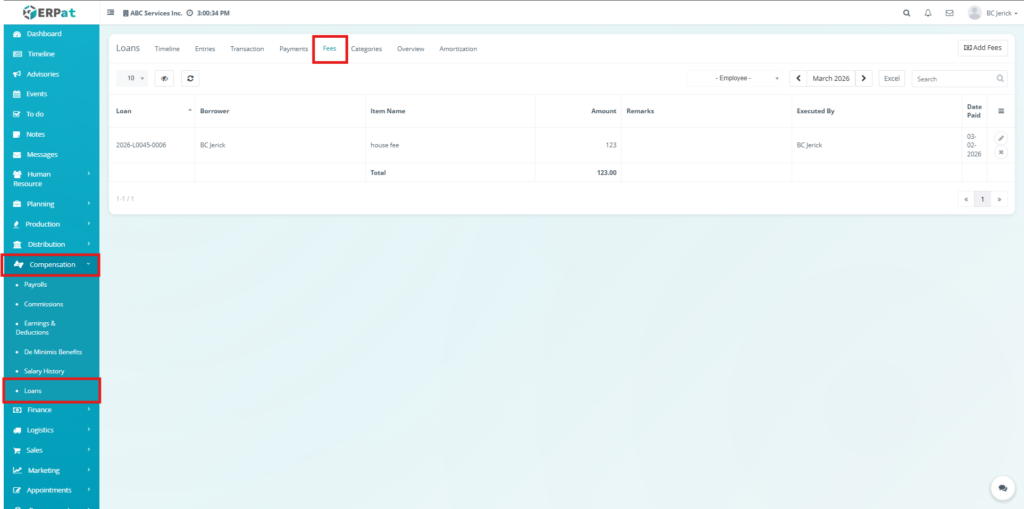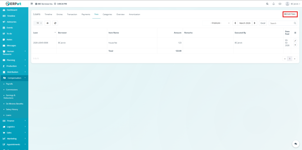 The Fees Tab manages additional charges associated with loans, such as penalties or service fees. It allows users to record, update, and monitor fees, ensuring that all extra costs are properly tracked and reflected in loan balances.