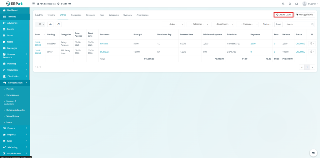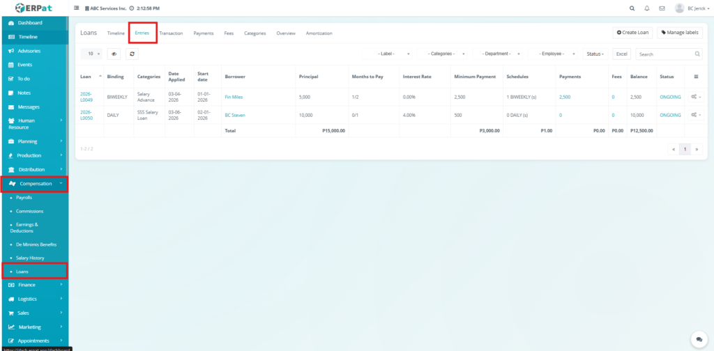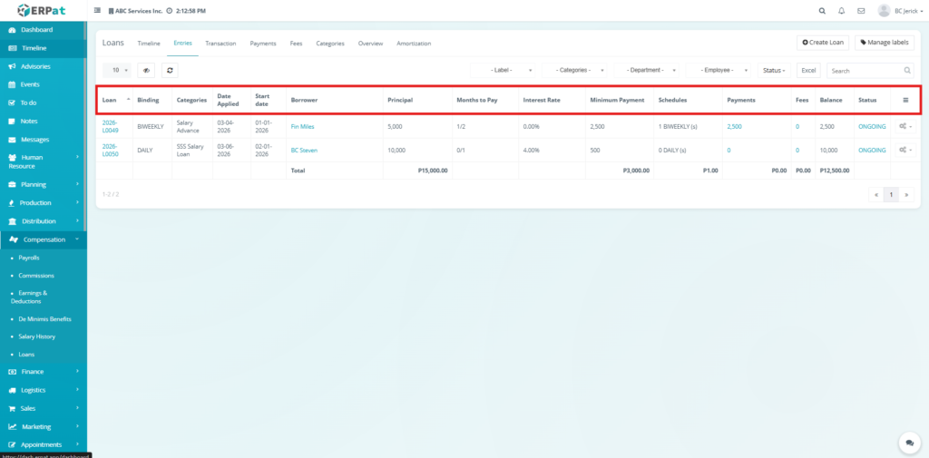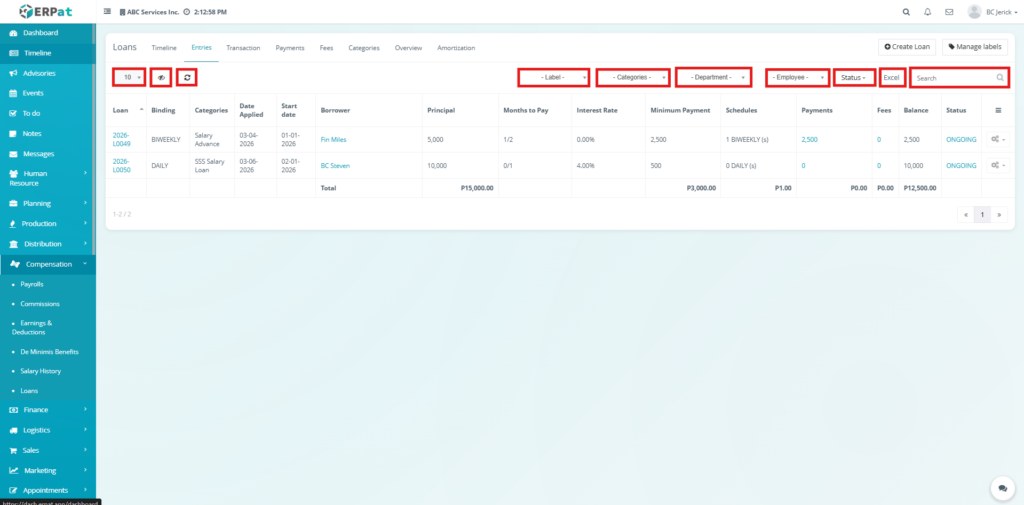 The Entries Tab serves as the main workspace for managing loan records. It allows users to create, update, and monitor loans, including borrower details, loan terms, balances, and statuses. It provides a centralized view of all loan information and supports full lifecycle management.