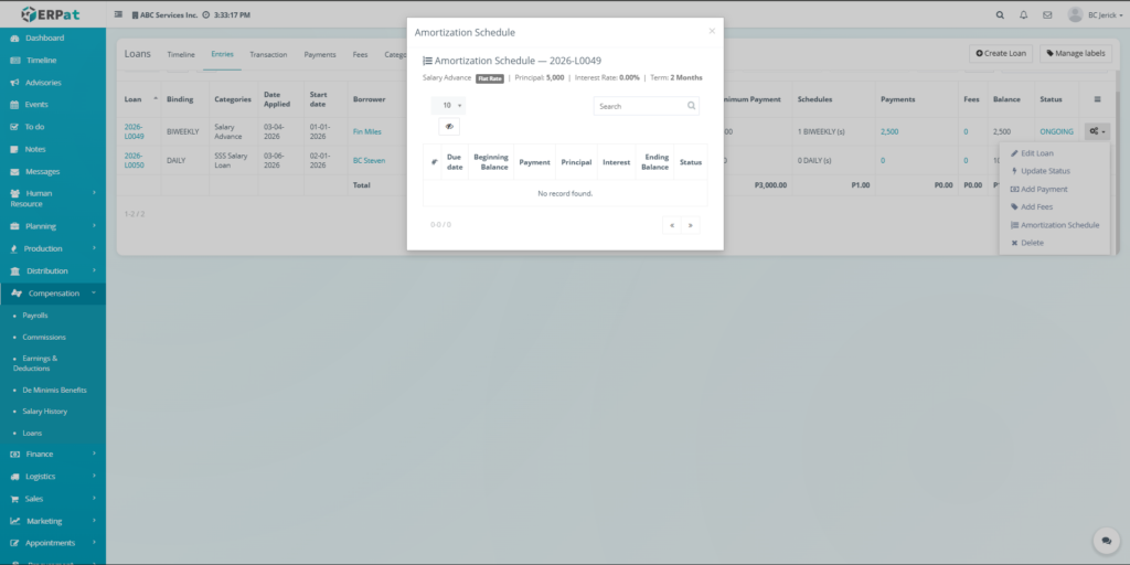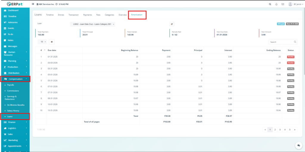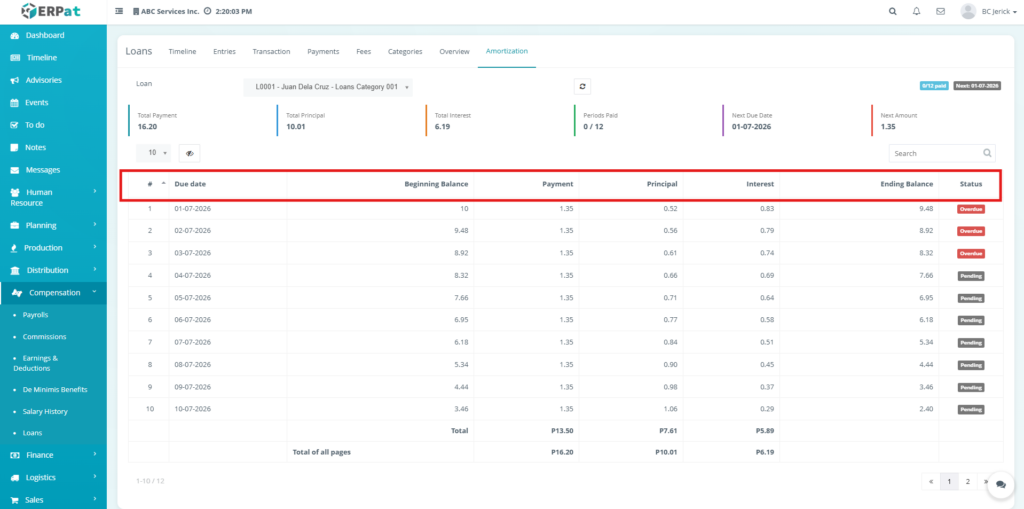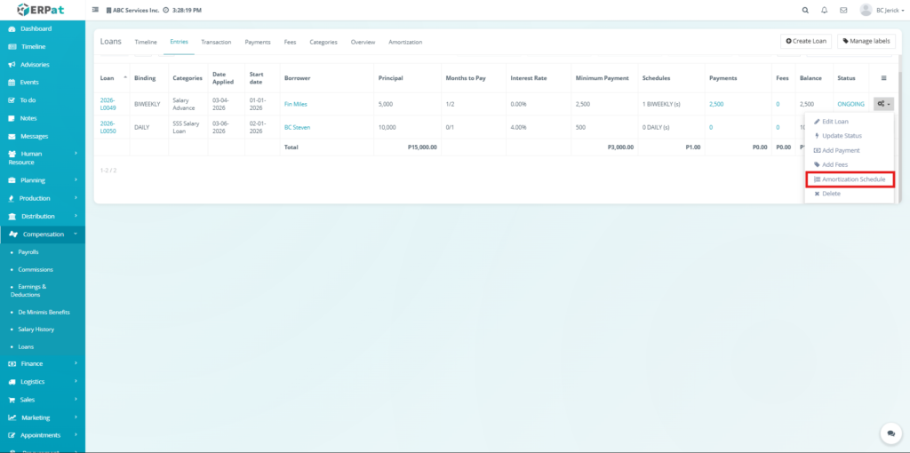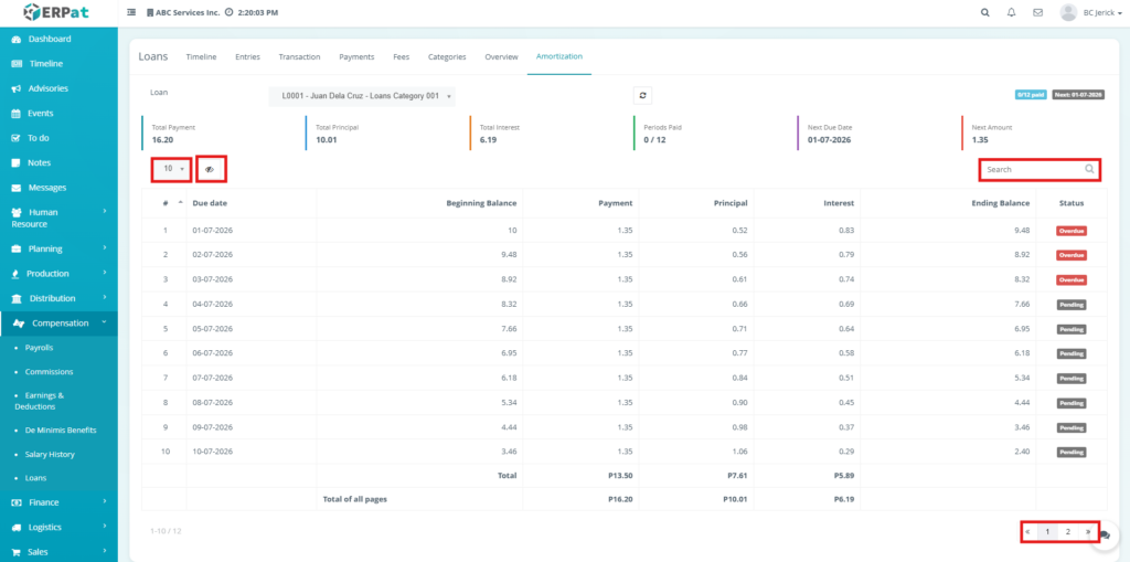 - The system will redirect to the amortization schedule of the selected loan.
