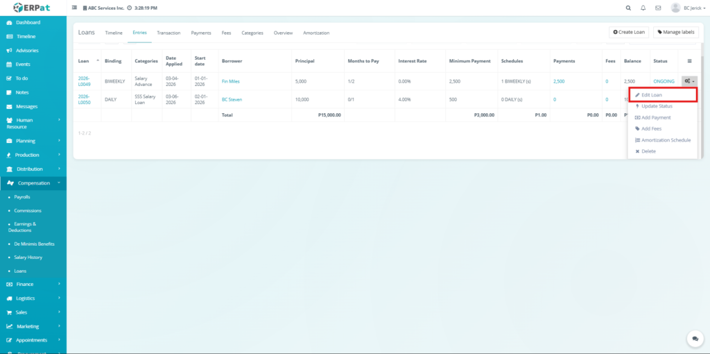 - Select Edit Loan.