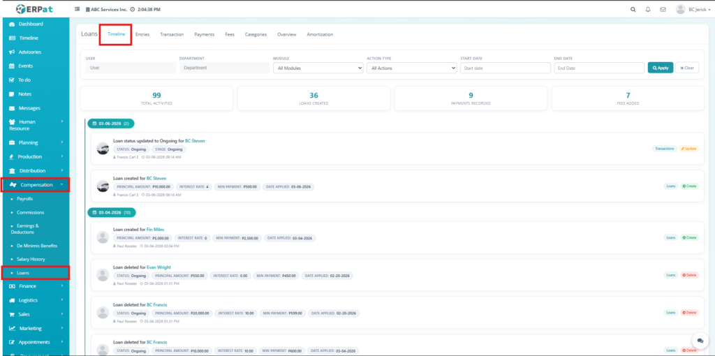 The Timeline Tab provides a chronological view of all loan-related activities, including creation, updates, payments, and status changes. It helps users track system actions, monitor user activity, and review the history of loan transactions for auditing and transparency.