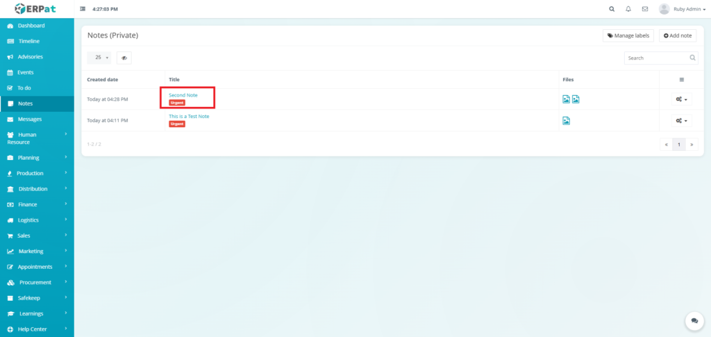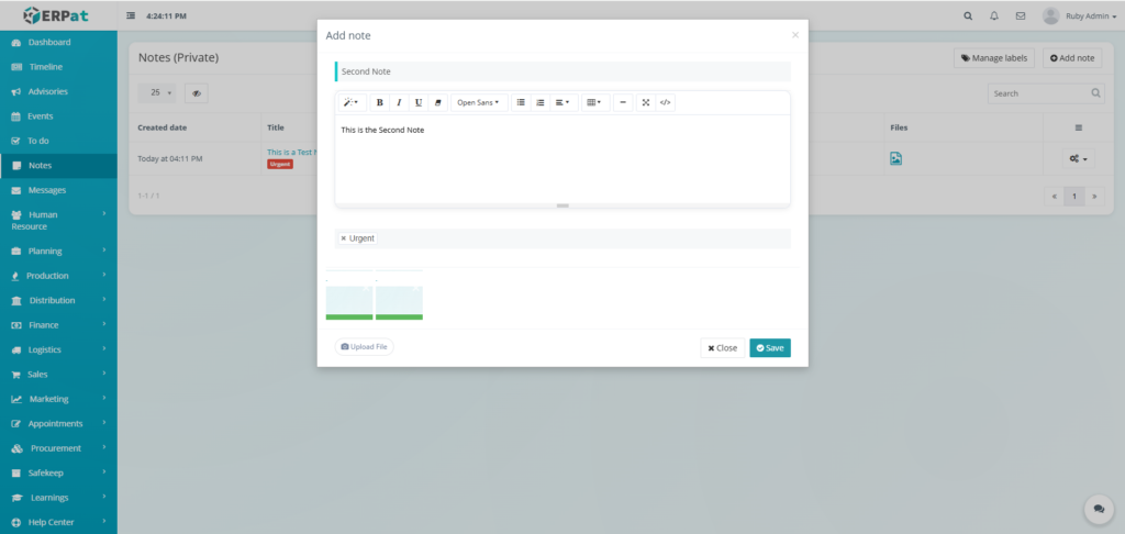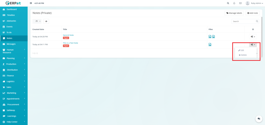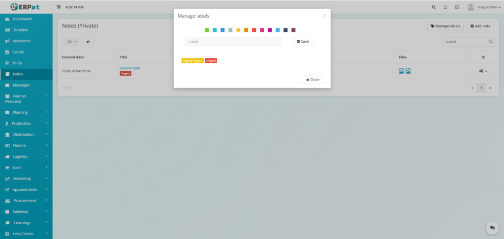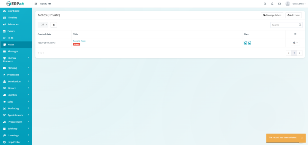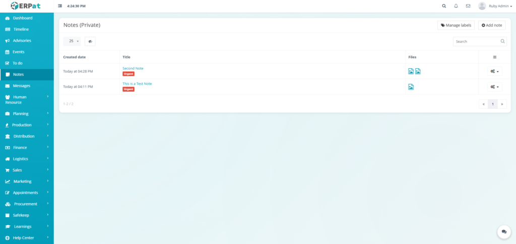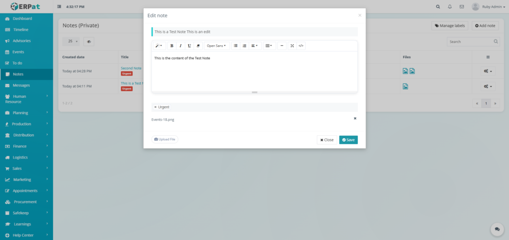 The Notes Module is a private, user-specific note-taking and personal information management system within the ERPat platform. It enables individual users to create, organize, and quickly retrieve personal notes, reminders, and reference information in a secure, private workspace.