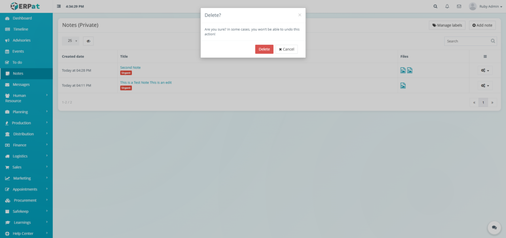 - Click the Delete button to remove the note.
