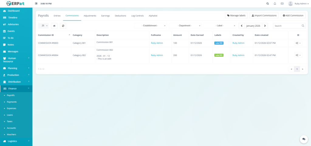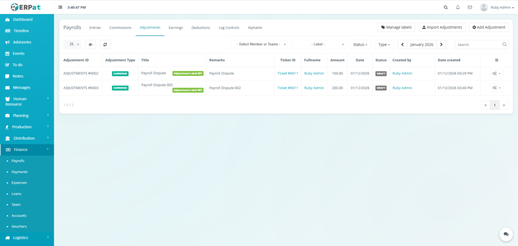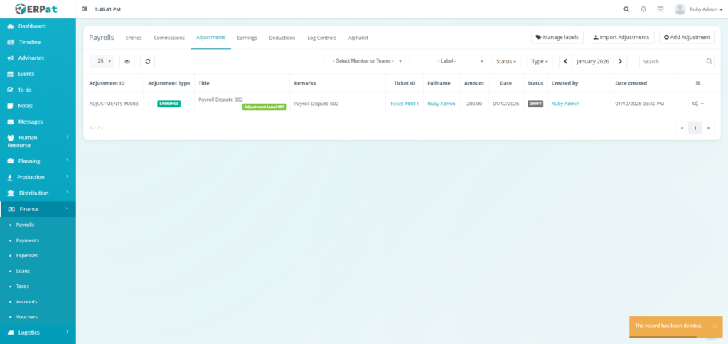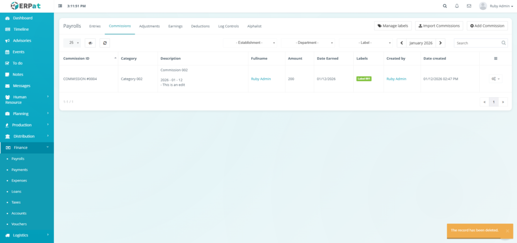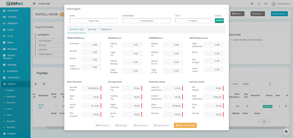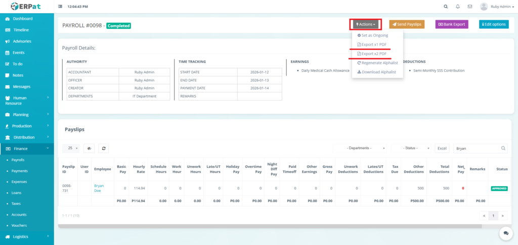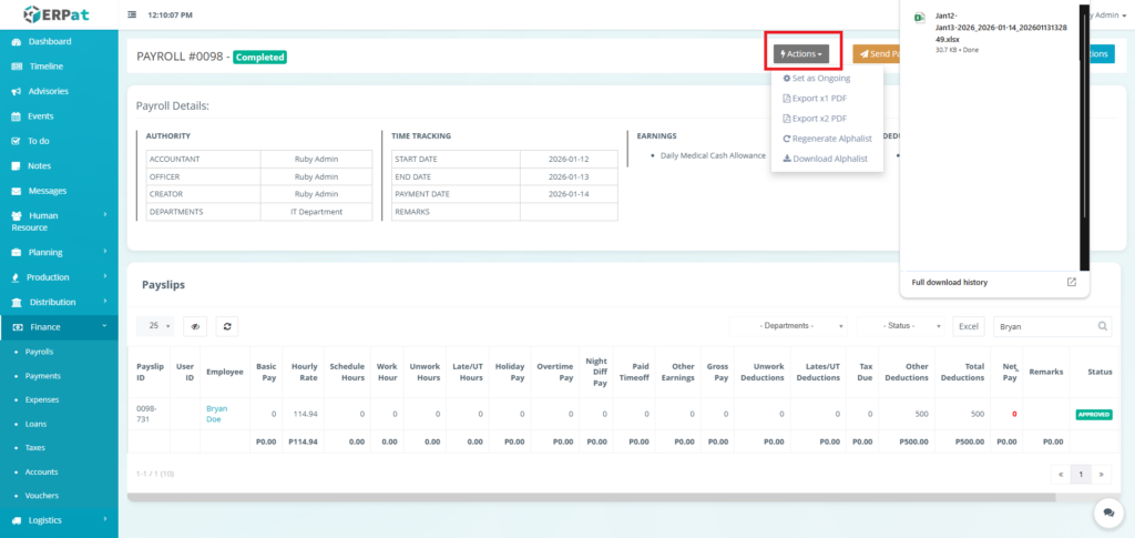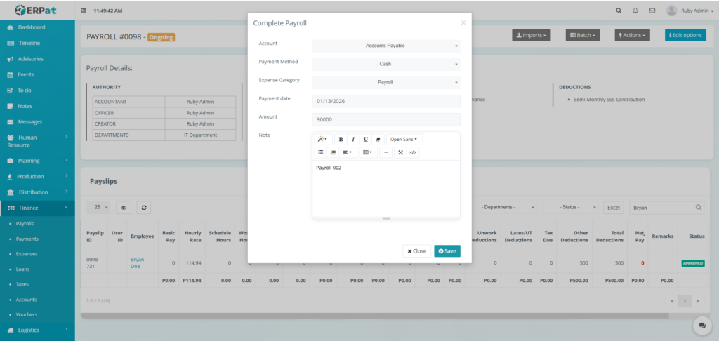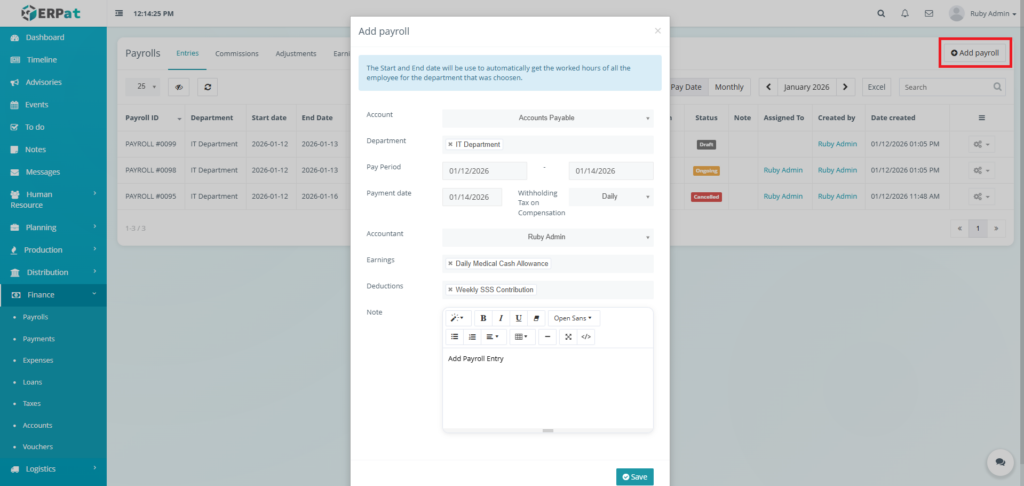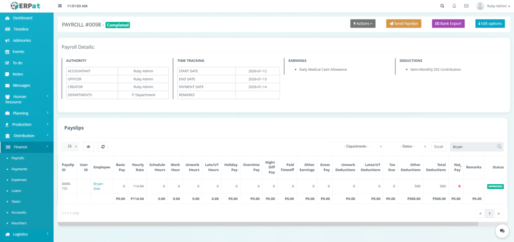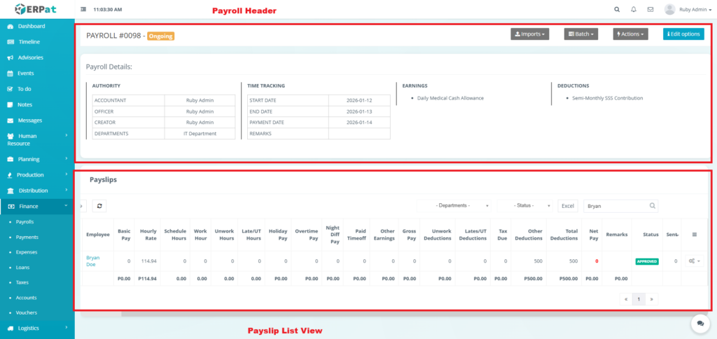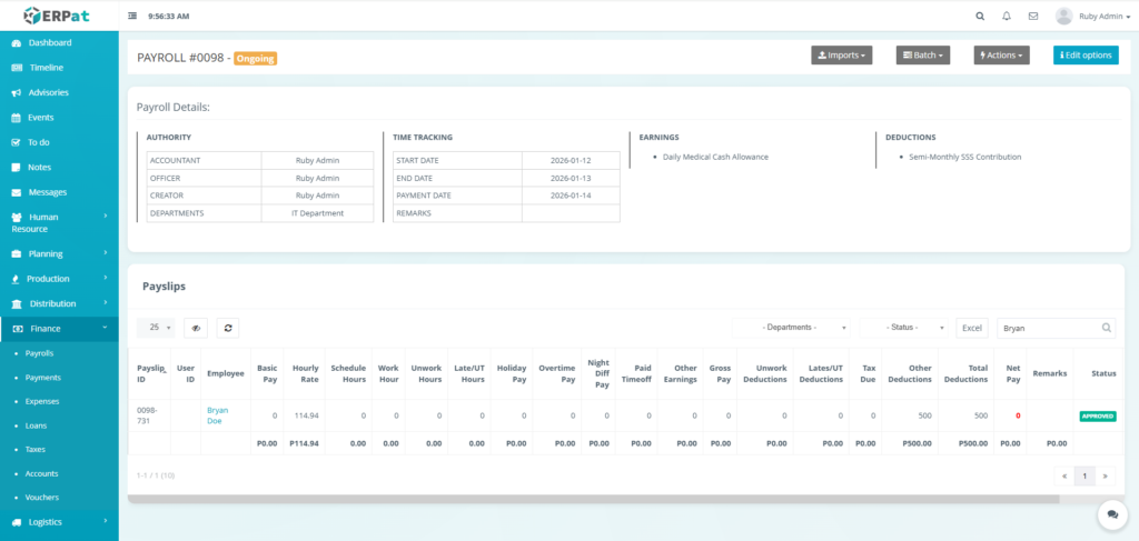 It enables Finance and HR teams to manage payroll runs, define earnings and deductions, apply commissions and adjustments, monitor payroll activities through logs, and generate government-required reports such as the Alphalist. By consolidating all payroll-related functions into a single module, the system ensures accurate payroll processing, regulatory compliance, transparency, and audit readiness.