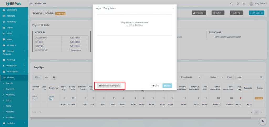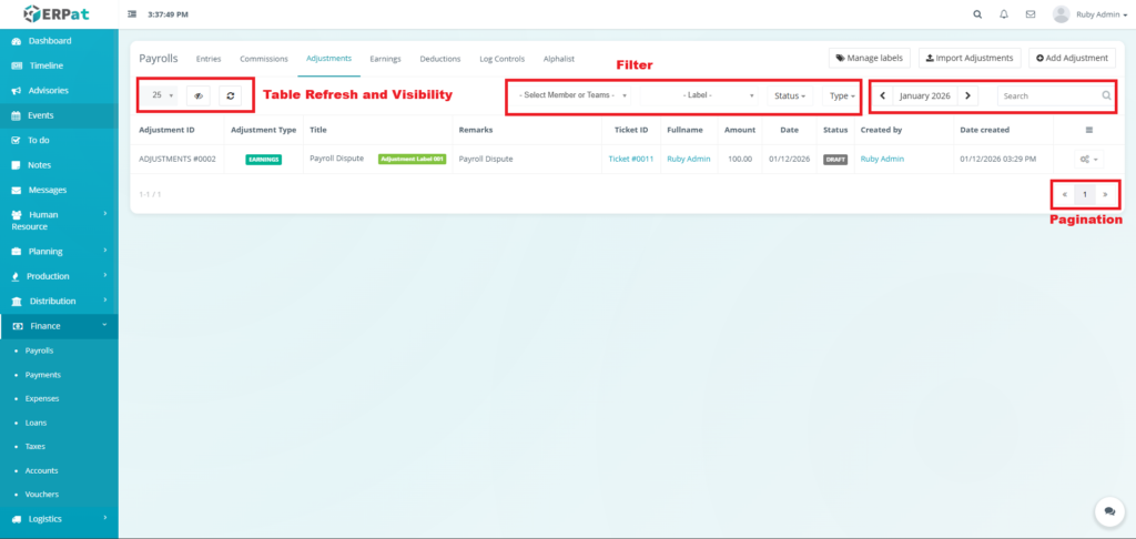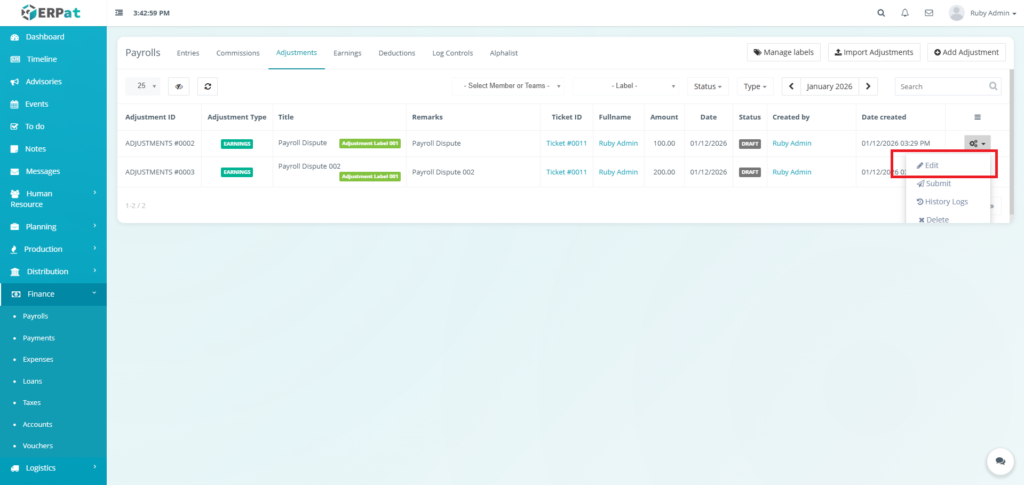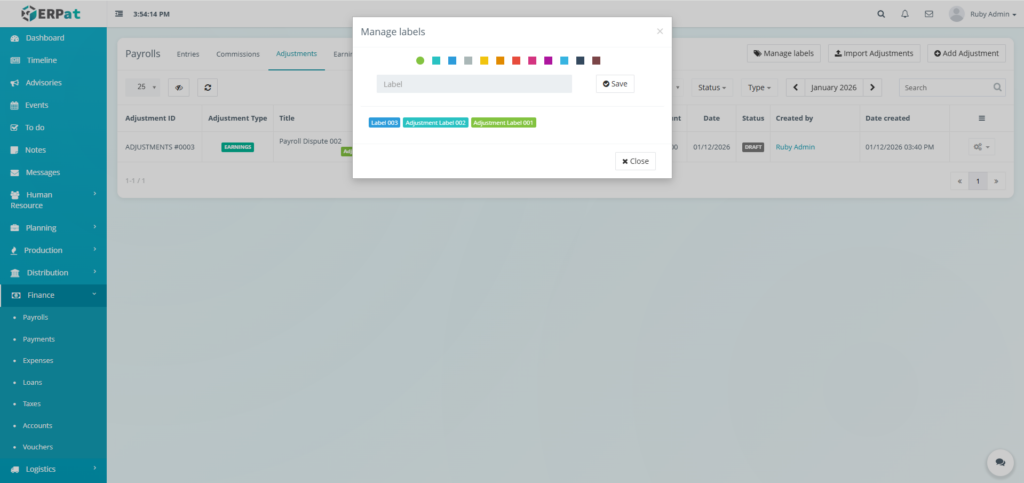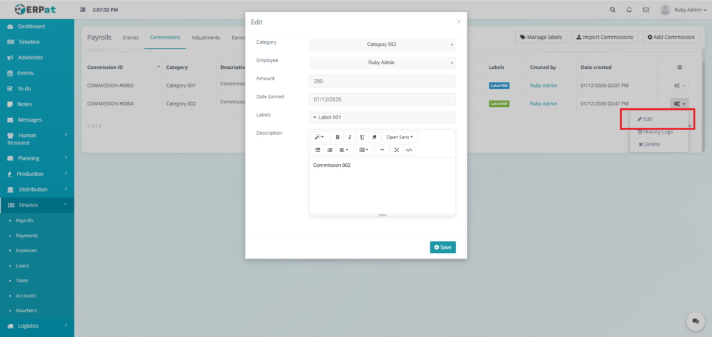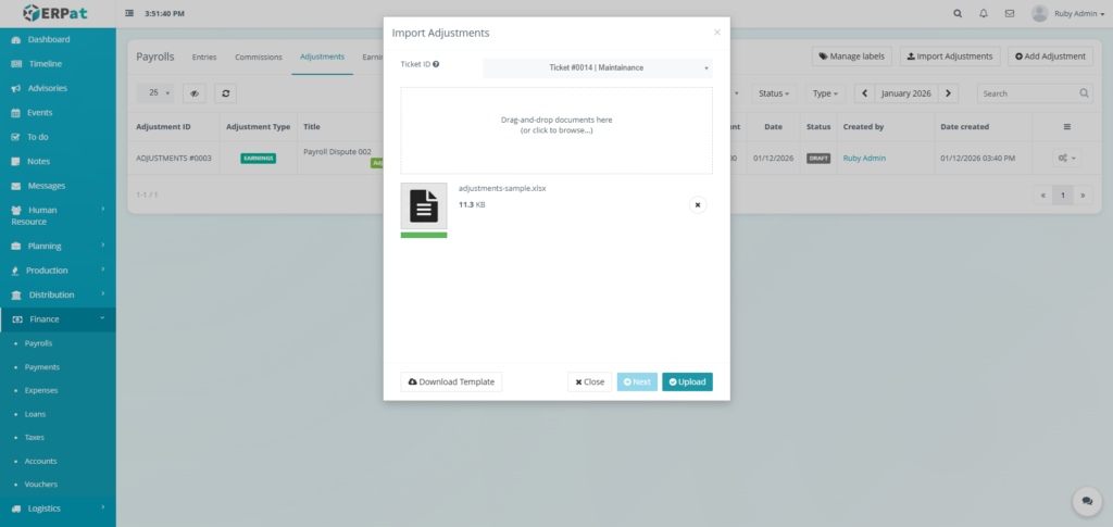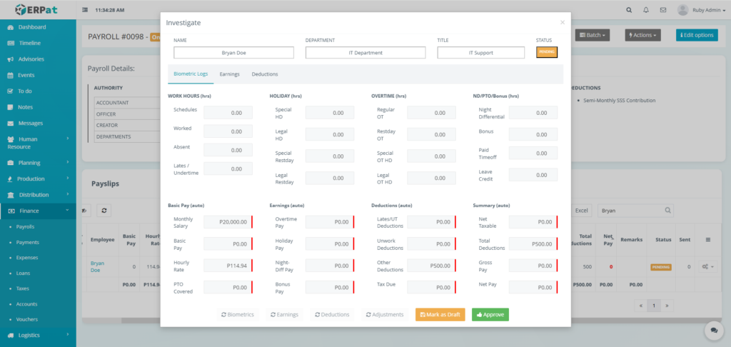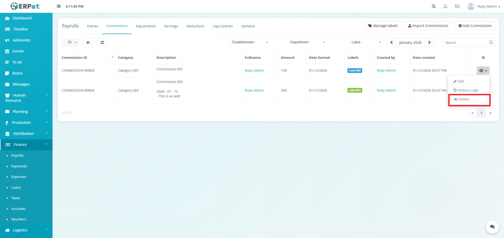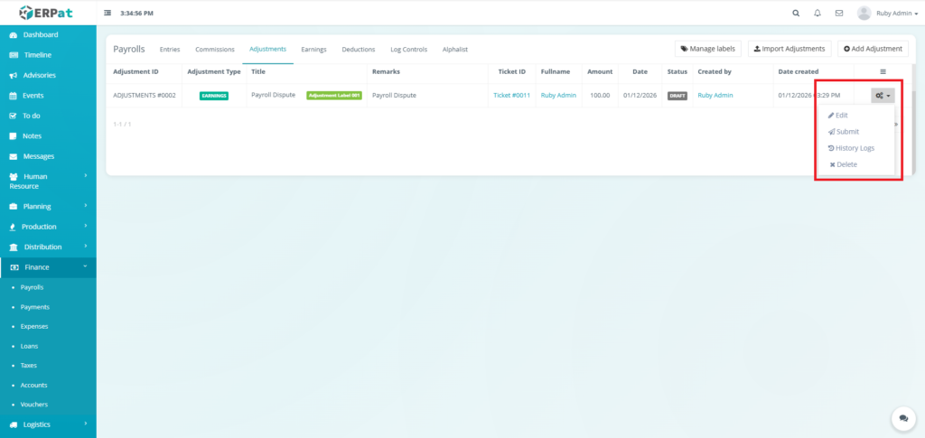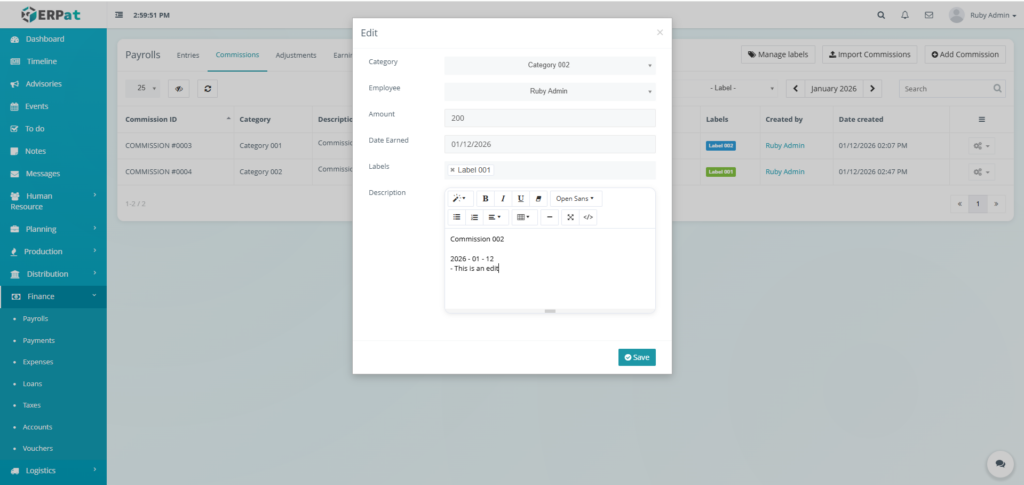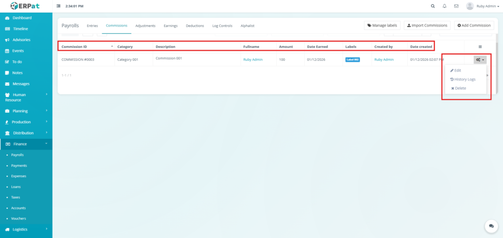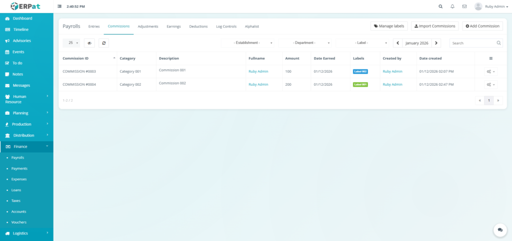 It enables Finance and HR teams to manage payroll runs, define earnings and deductions, apply commissions and adjustments, monitor payroll activities through logs, and generate government-required reports such as the Alphalist. By consolidating all payroll-related functions into a single module, the system ensures accurate payroll processing, regulatory compliance, transparency, and audit readiness.