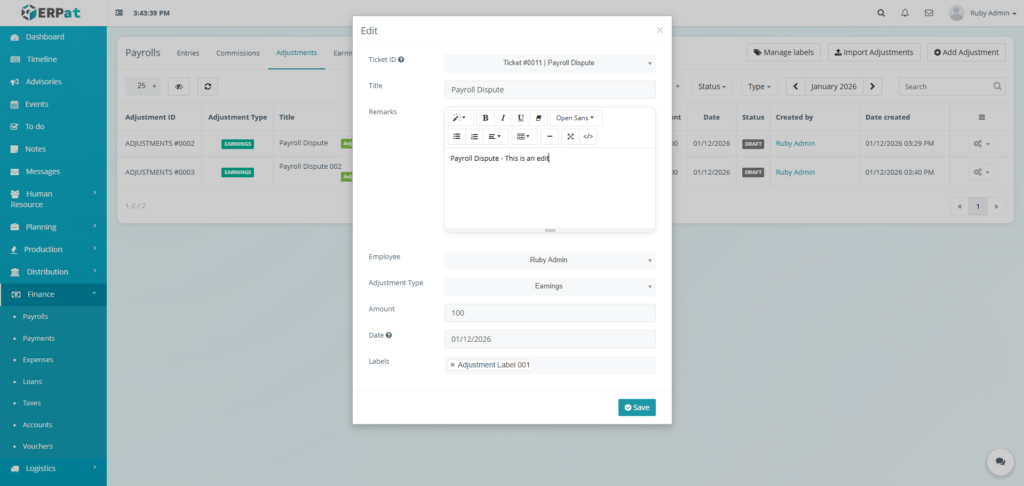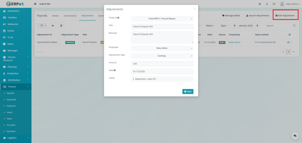 - Click the Save button to add the adjustment.