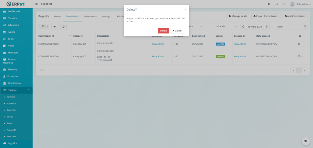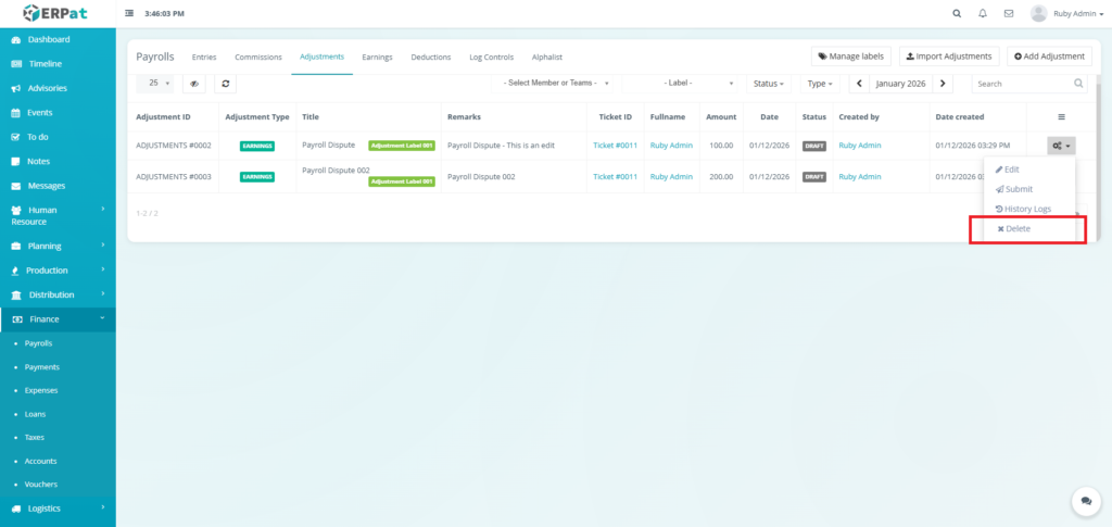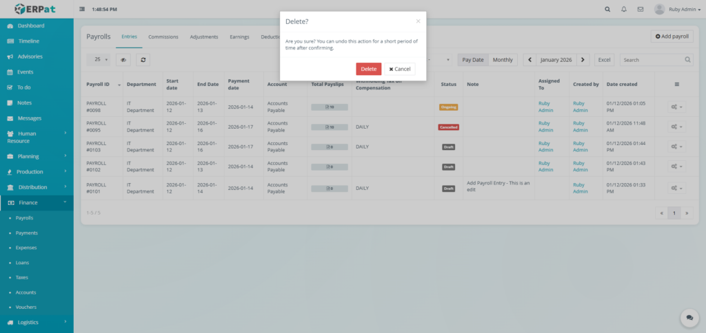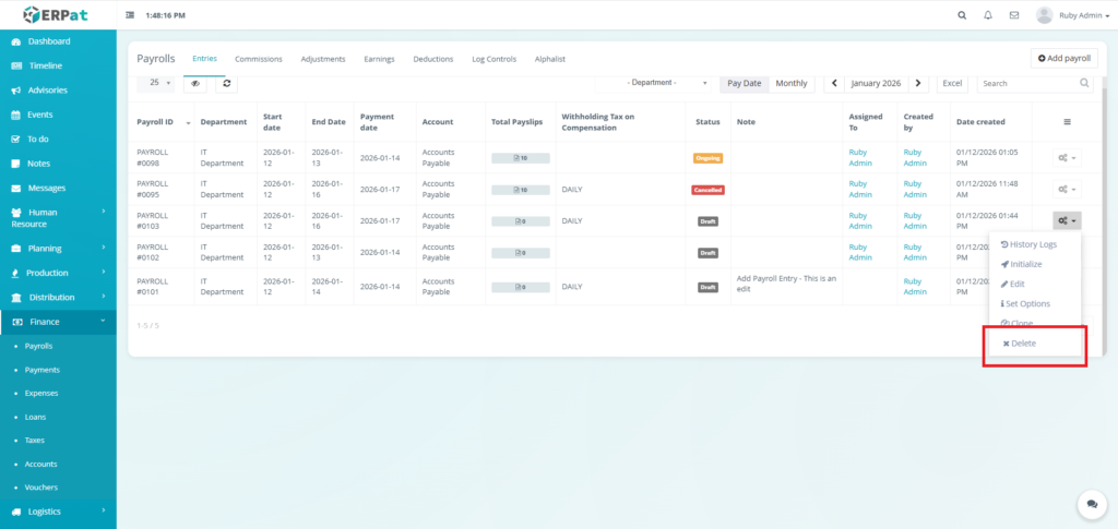 - Click the Delete button to remove the payroll entry..