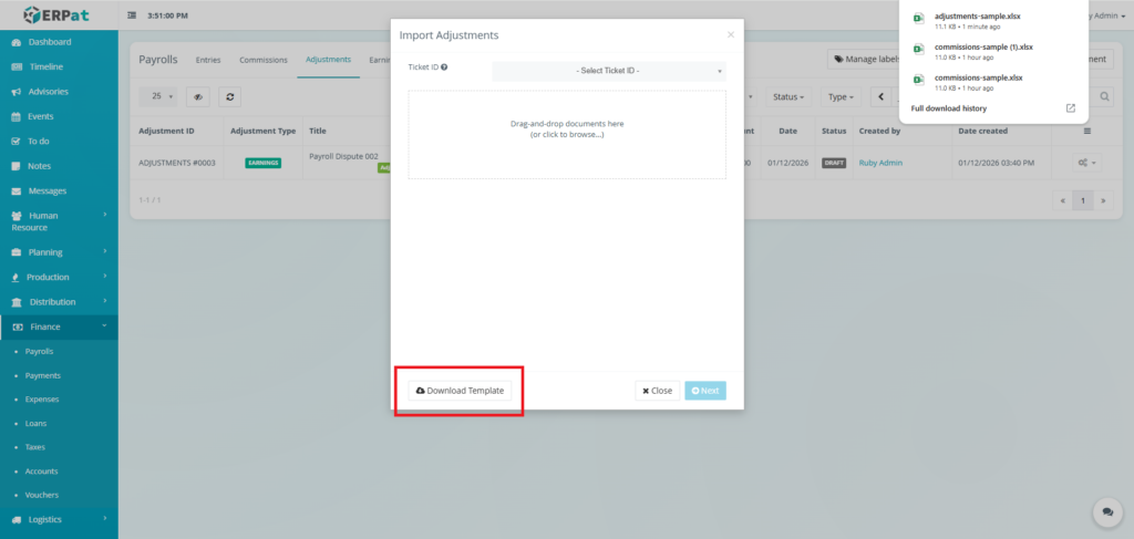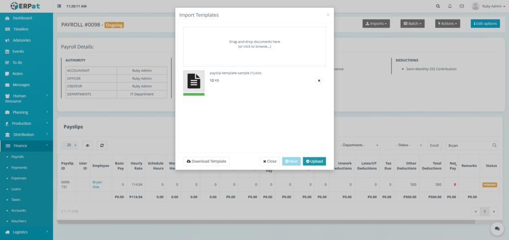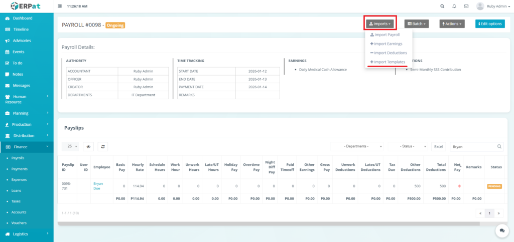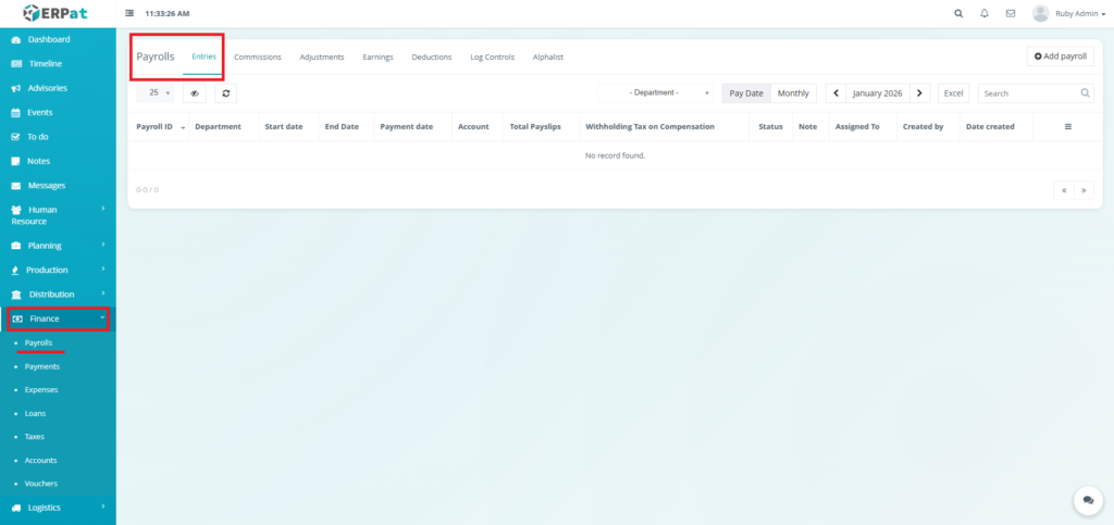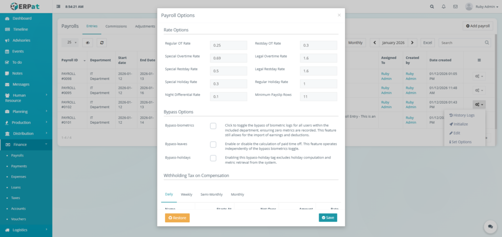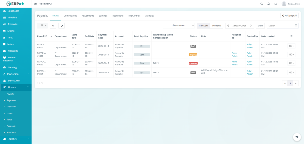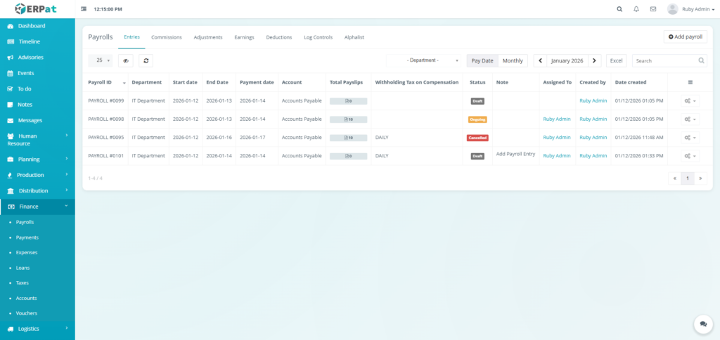 The Payrolls Module in the ERPat System is a unified payroll management workspace that supports the complete payroll process—from payroll creation and configuration to compensation computation, adjustments, logging, and statutory reporting.