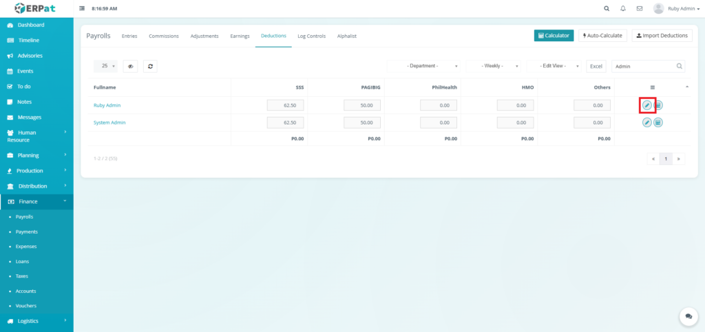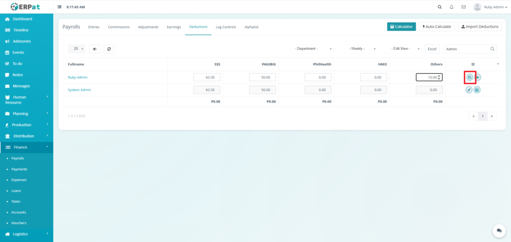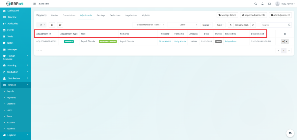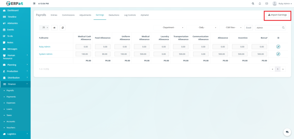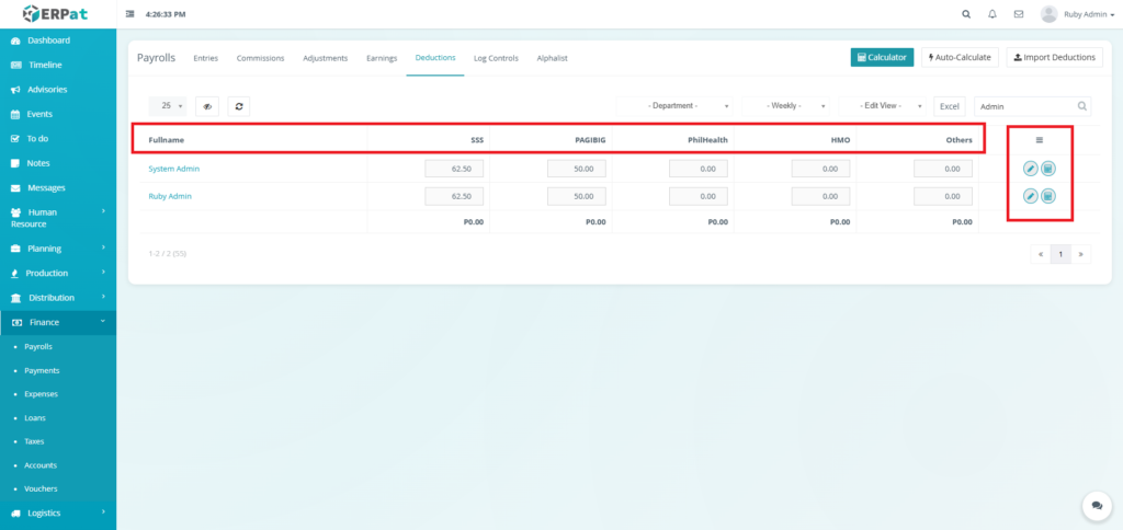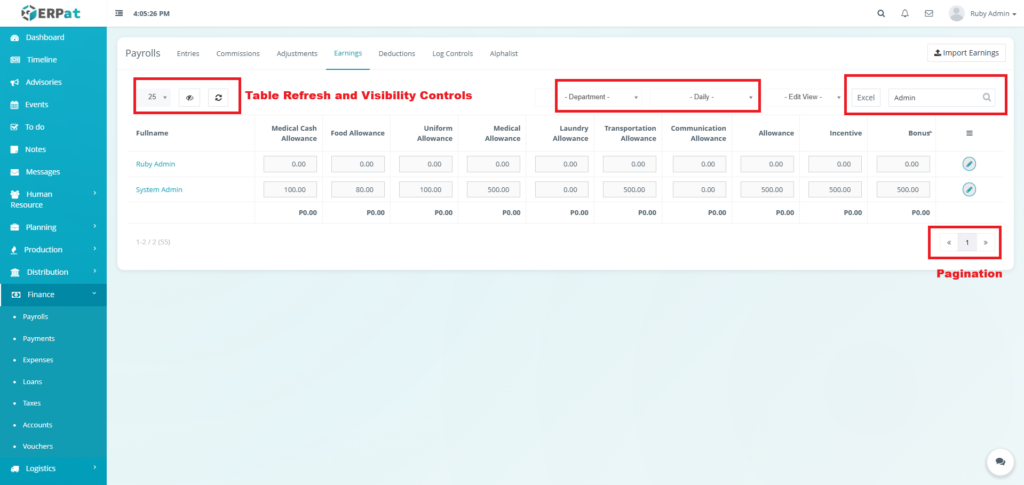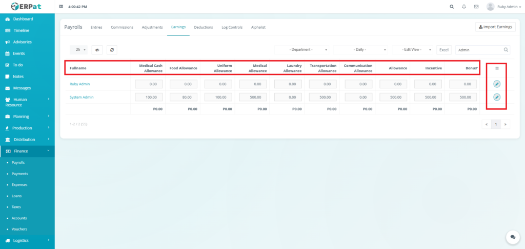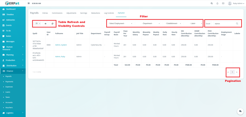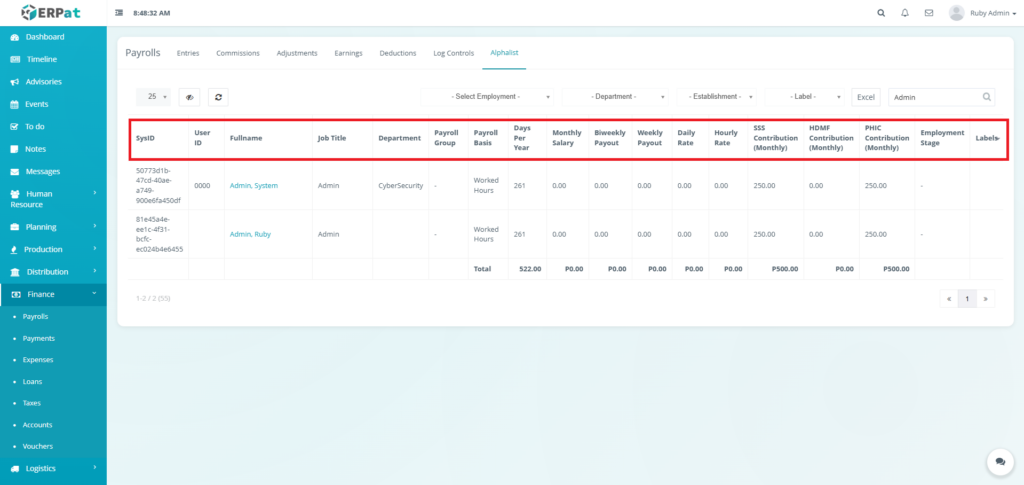 - Fullname – Employee name (e.g., Ruby Admin, System Admin)