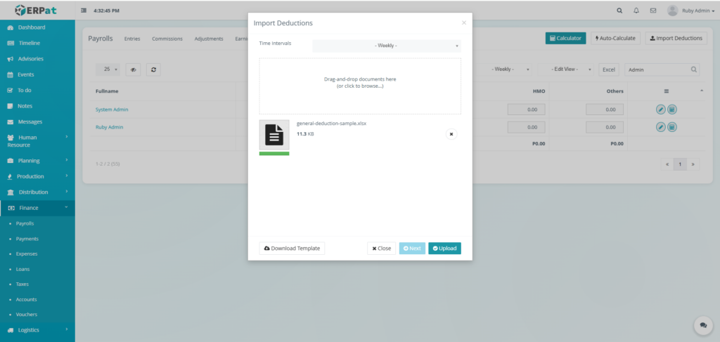 - Click the Next button then Upload button to insert multiple deductions.