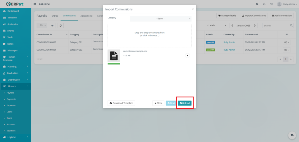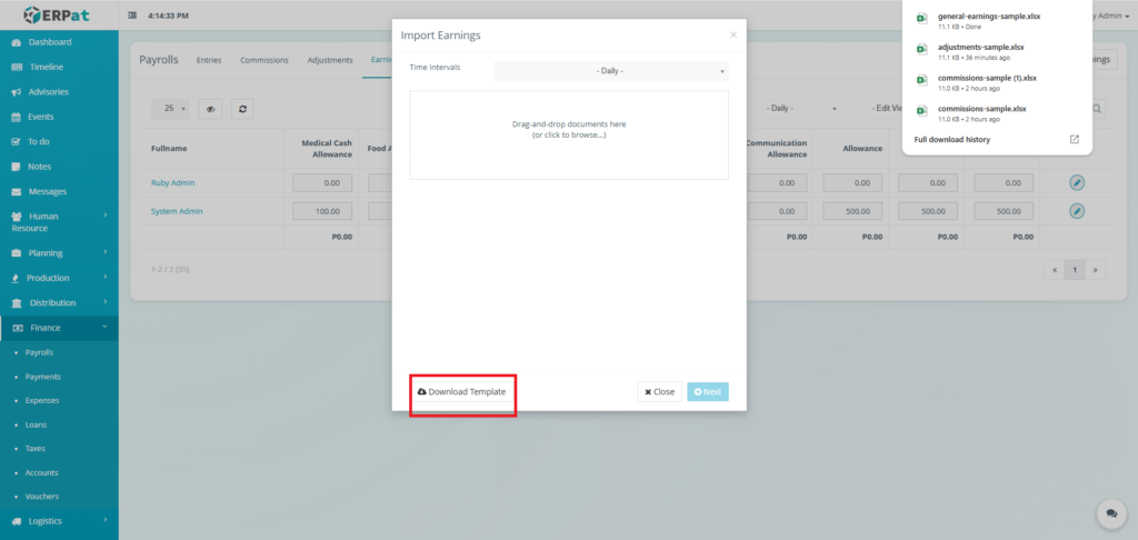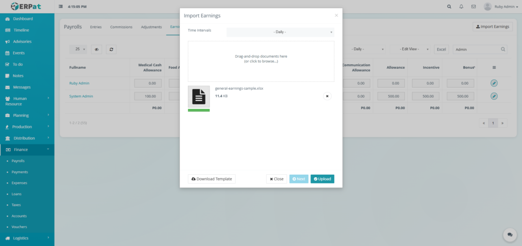 - Click the Next button then Upload button to insert multiple earnings.