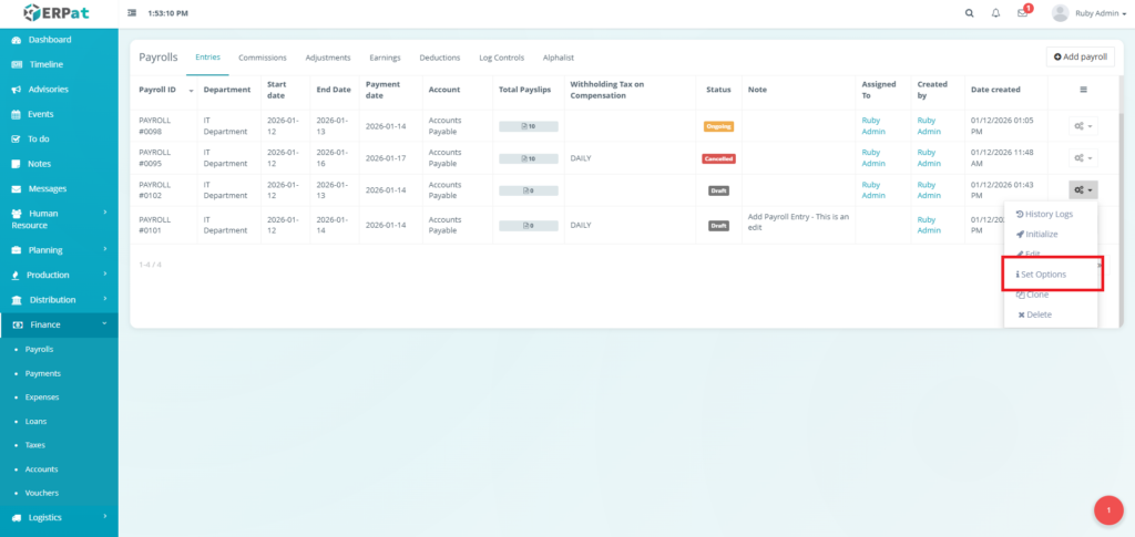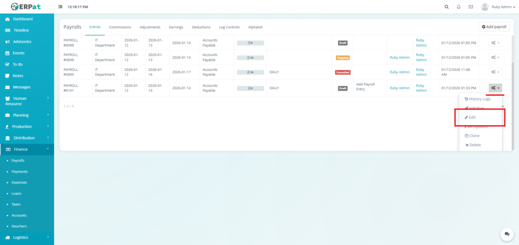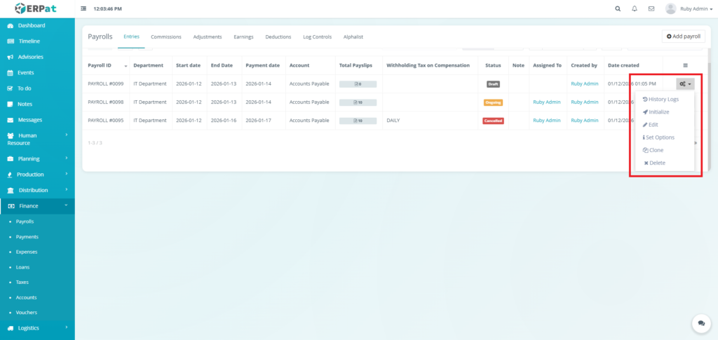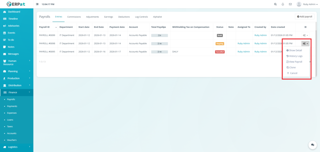 - Actions (Status: Draft) – Show Detail, History Logs, View Payroll, Clone, or Cancel