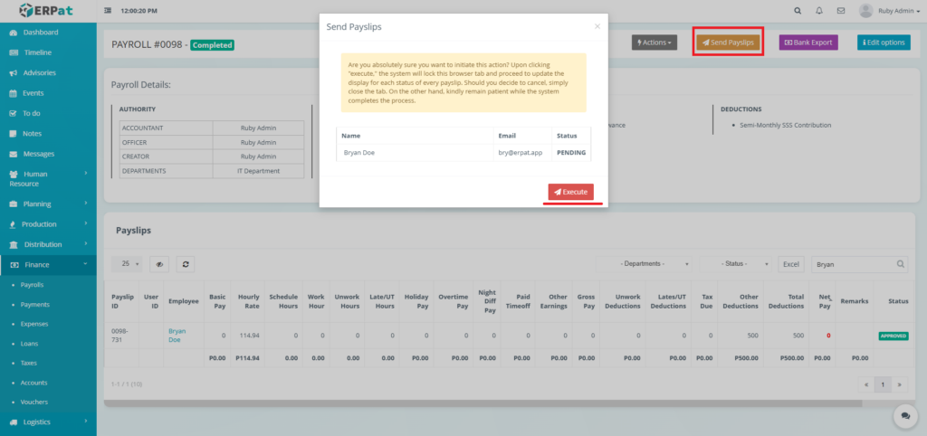- When selecting a department it applies the payroll to all the employees within the department.