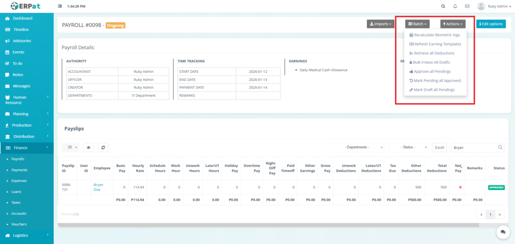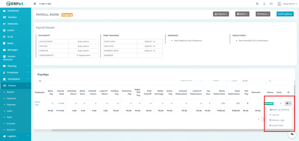 - Actions (Status: Ongoing) – Show Detail, History Logs, View Payroll, Clone, or Cancel