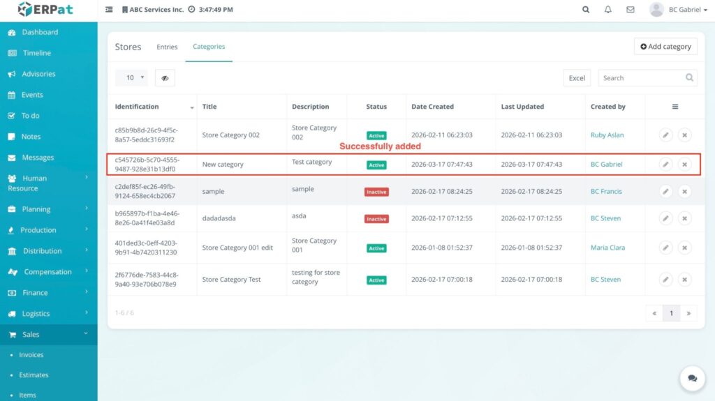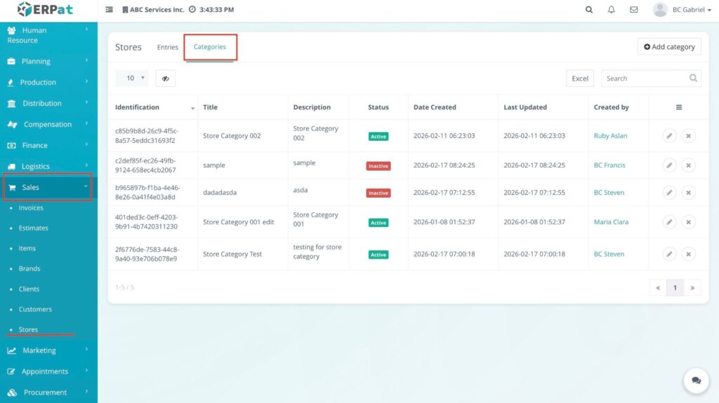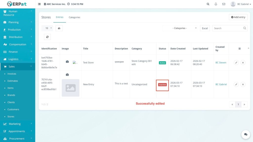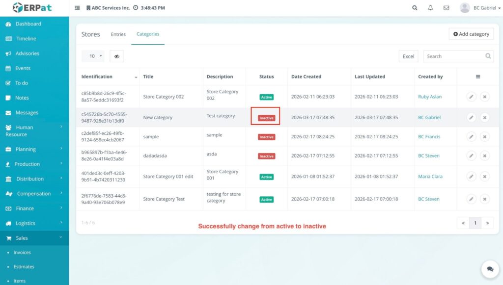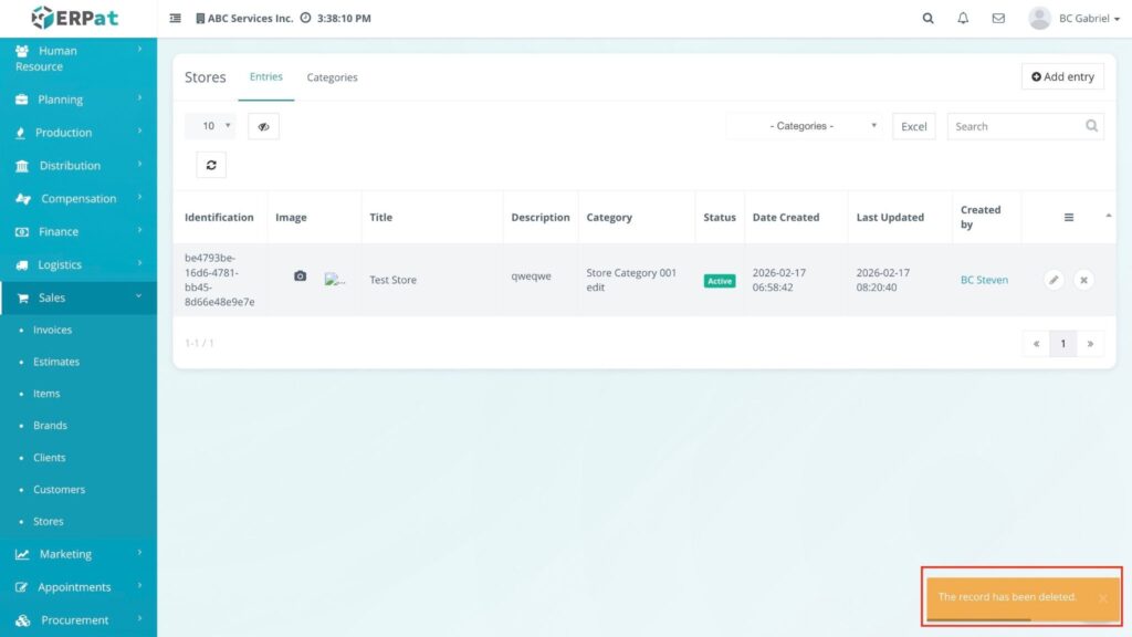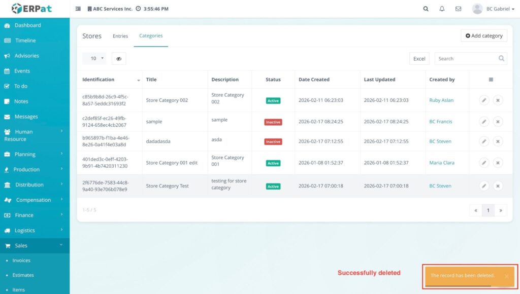 All creation, update, and deletion actions for store records and categories are logged for audit and compliance purposes within the ERPat System.