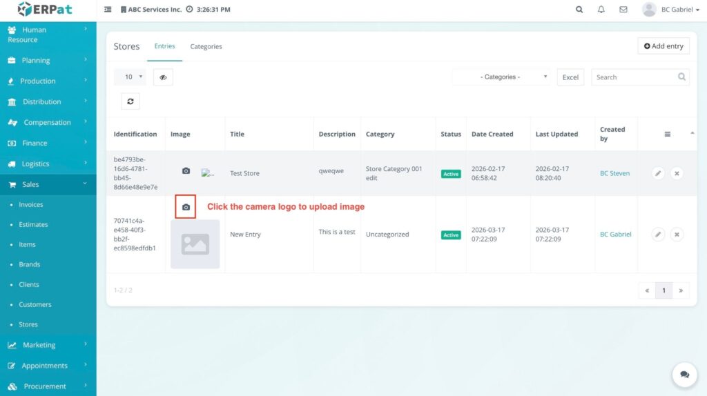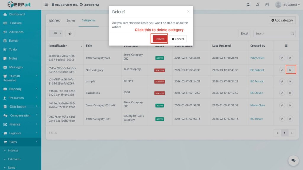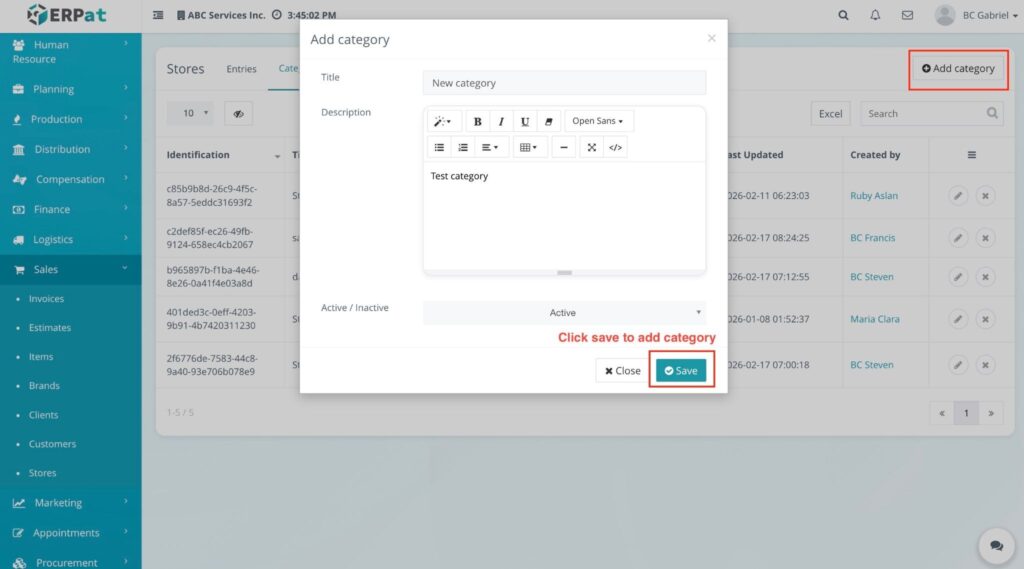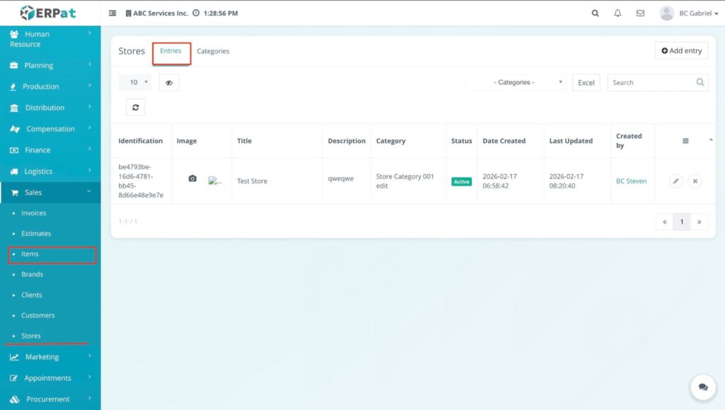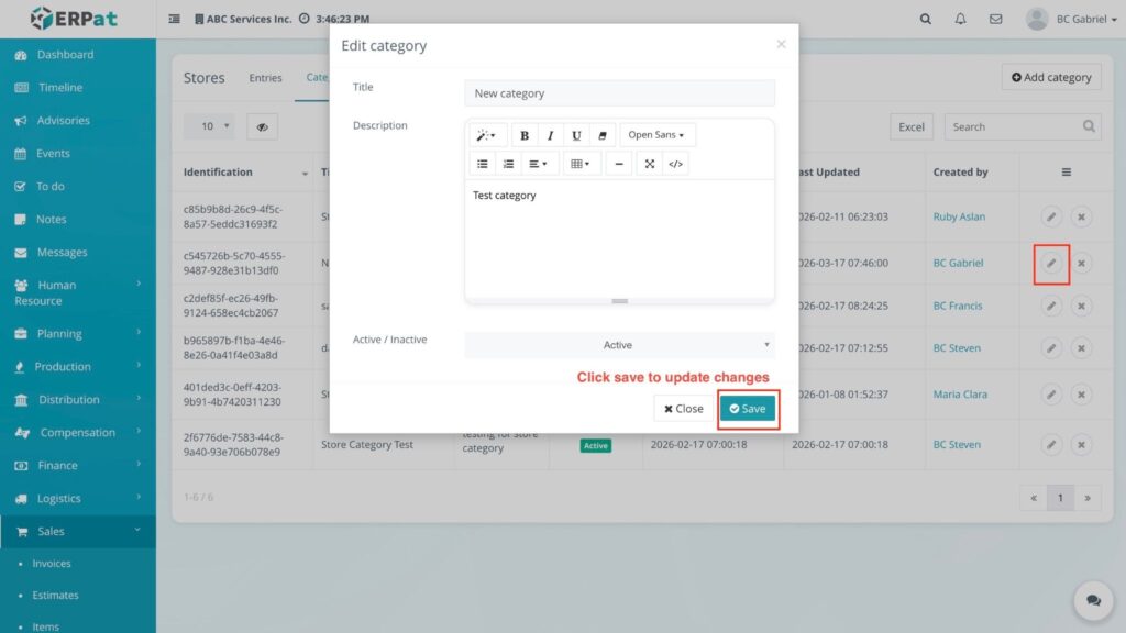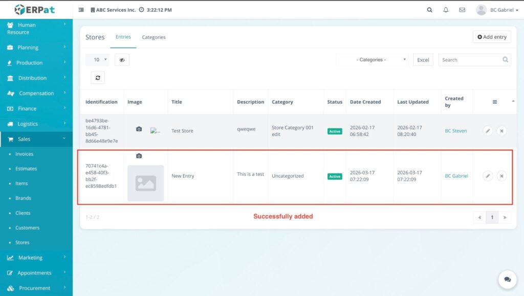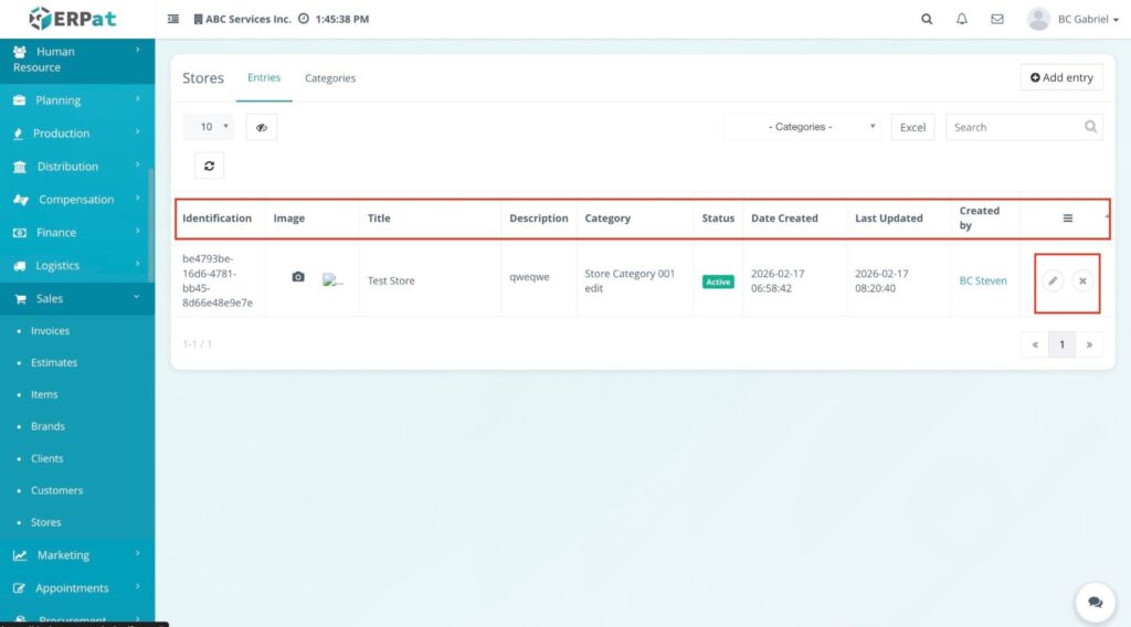 All creation, update, and deletion actions for store records and categories are logged for audit and compliance purposes within the ERPat System.