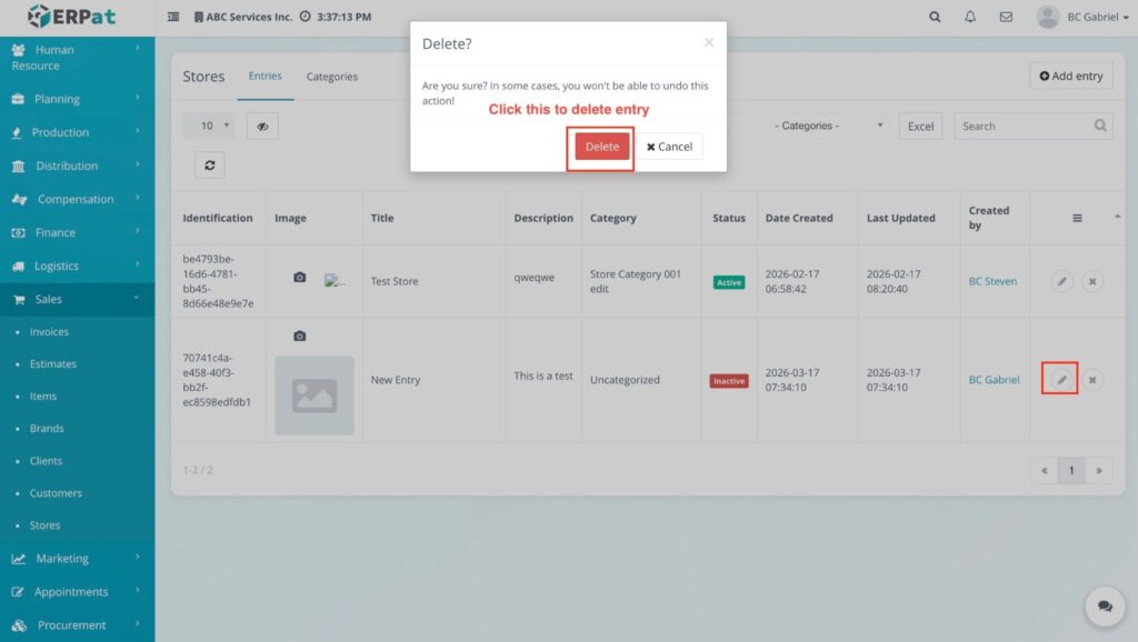 - Locate the specific store entry you wish to remove and click the Delete (✖) icon under the Actions column.
