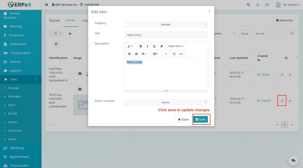 The modal closes, and the updated details (such as a status change to Inactive) are immediately reflected in the listing table.