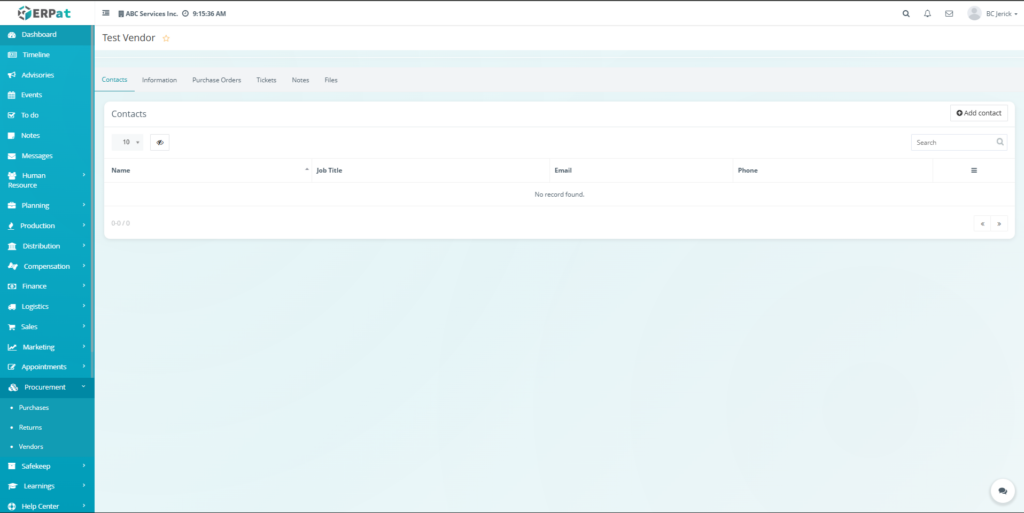 • Contacts Tab (Vendor Profile)