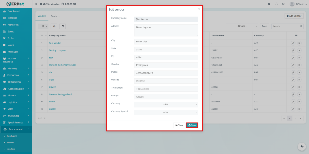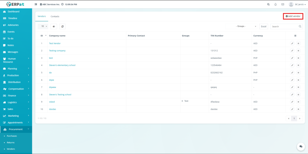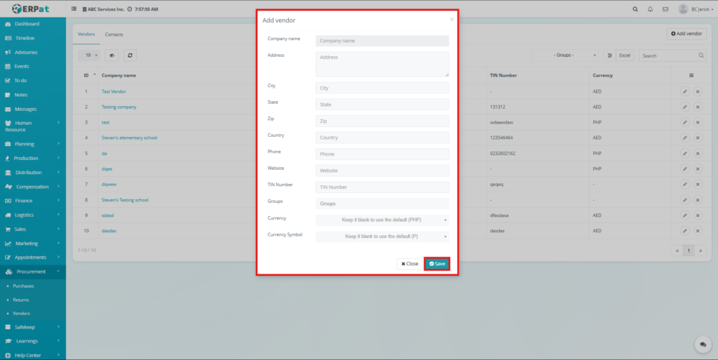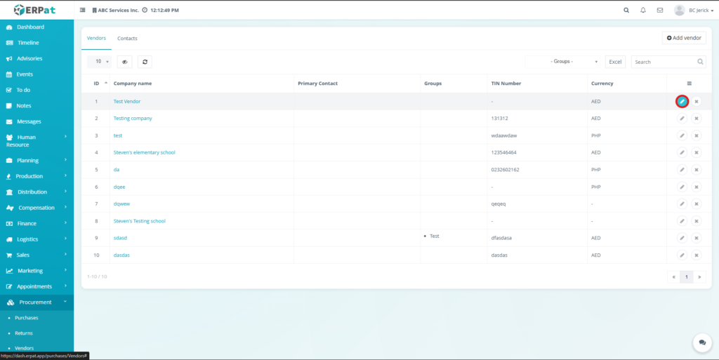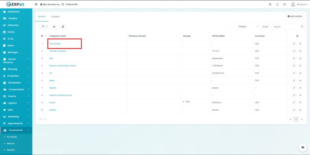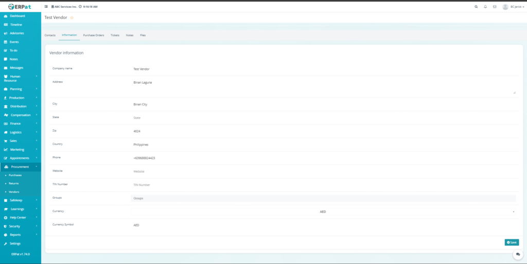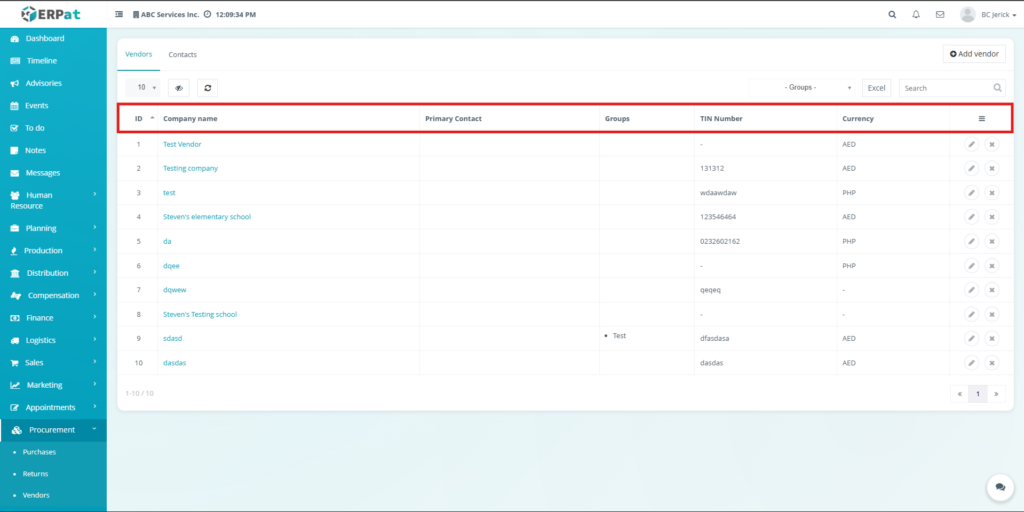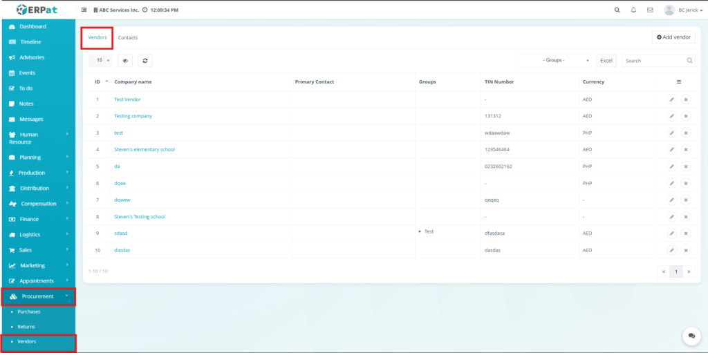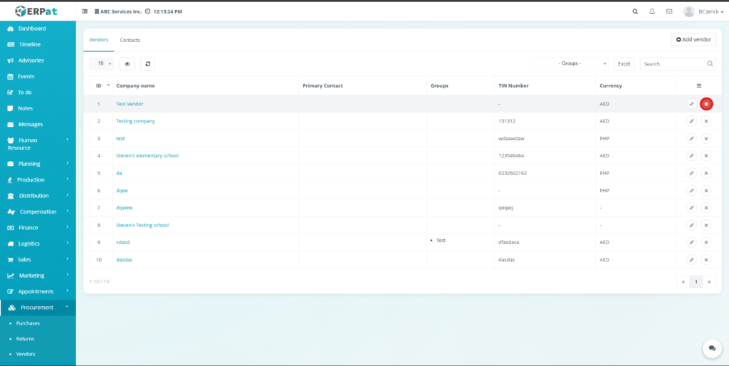 All create, update, and delete actions related to vendor and contact records are logged within the ERPat system to ensure traceability and accountability.