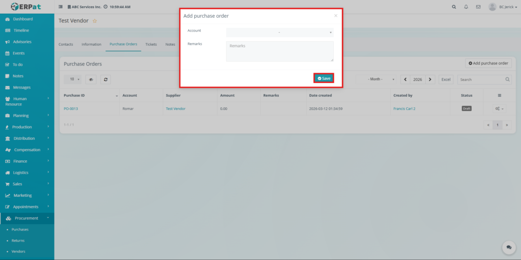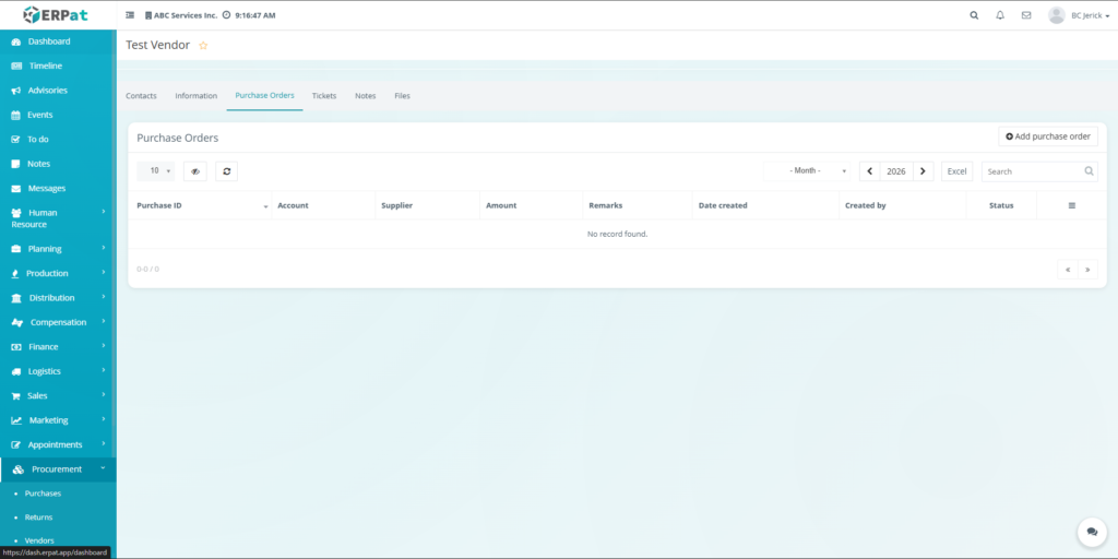 • Purchase Orders Tab (Vendor Profile)