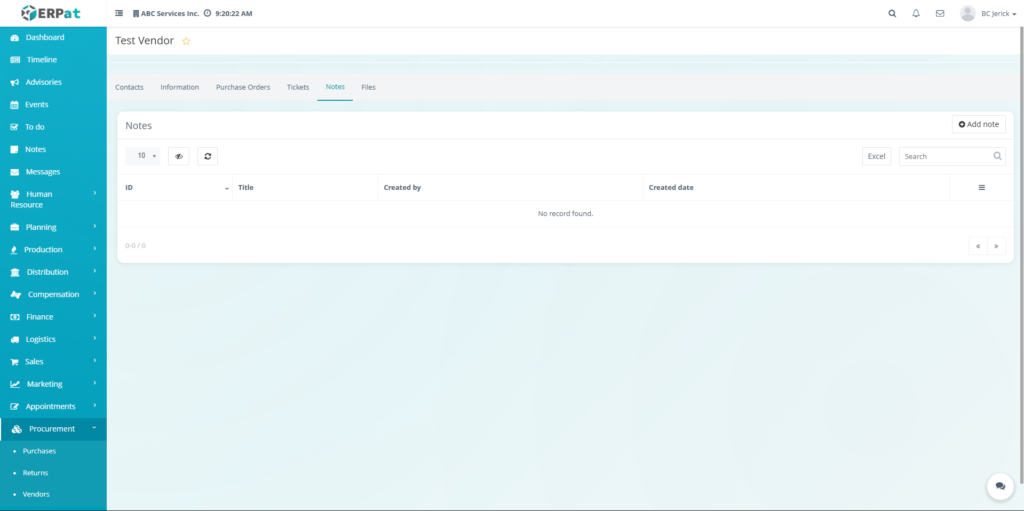 • Notes Tab (Vendor Profile)