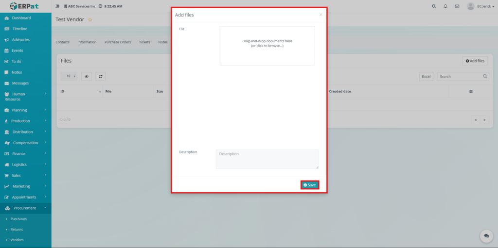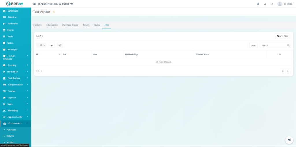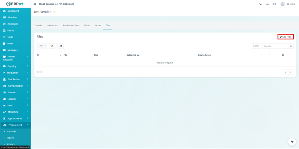 Users can upload vendor-related documents through the Add Files function.