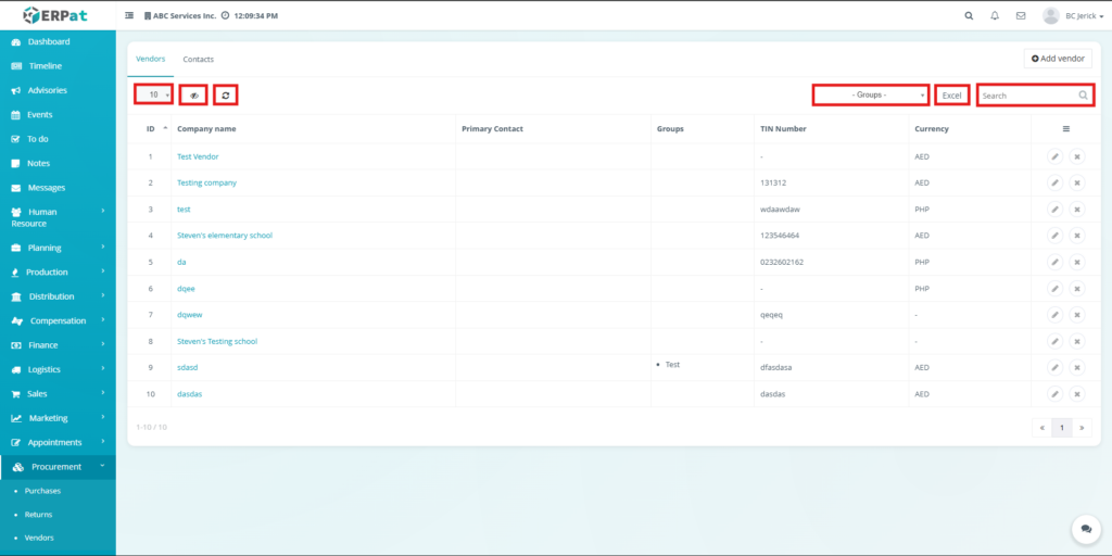 Users can quickly locate vendor and contact records using built-in filtering and search tools.