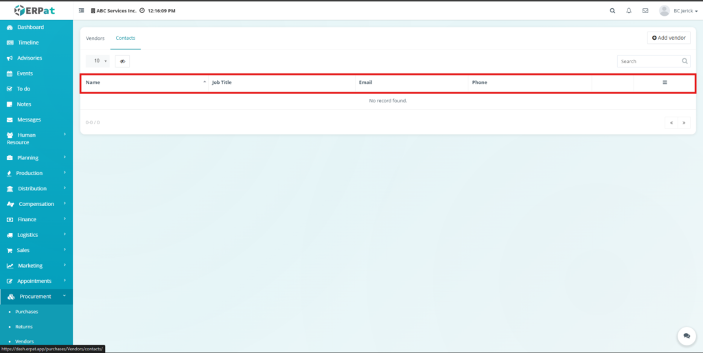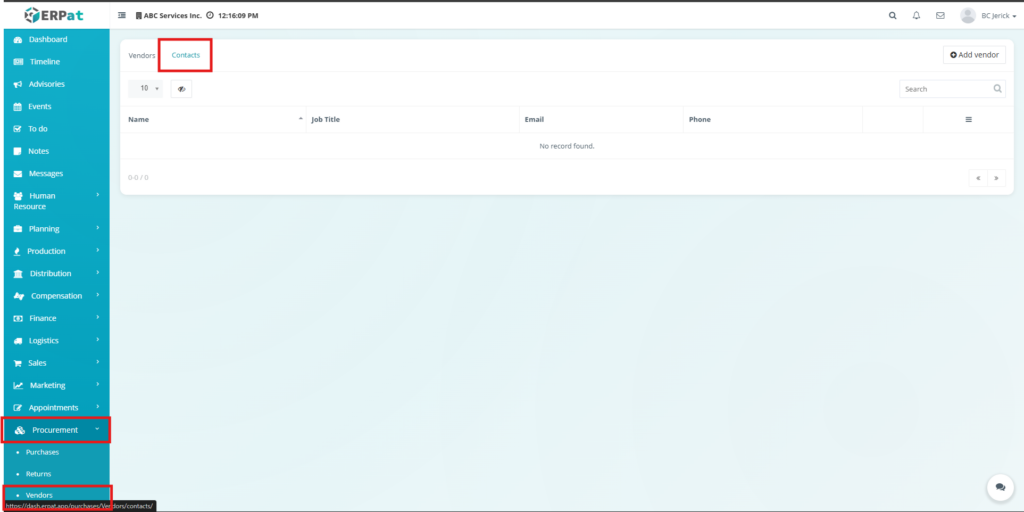 This tab provides a centralized list of all vendor contacts registered in the system.