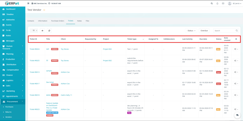 • Tickets Tab (Vendor Profile)