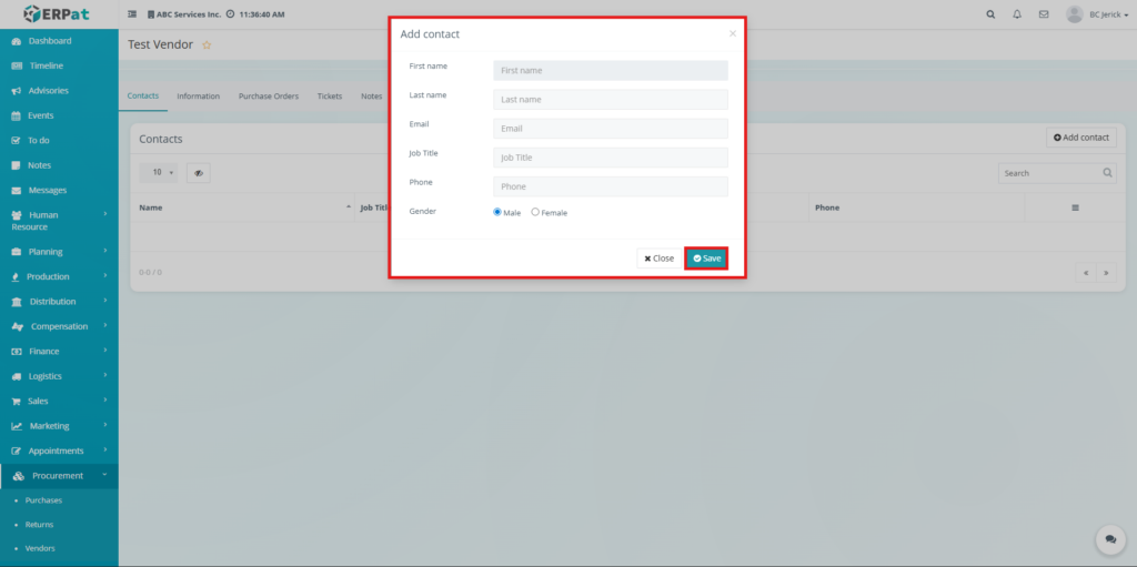 The Contacts Tab within the Procurement module allows users to manage vendor contact persons independently from the Vendors table.