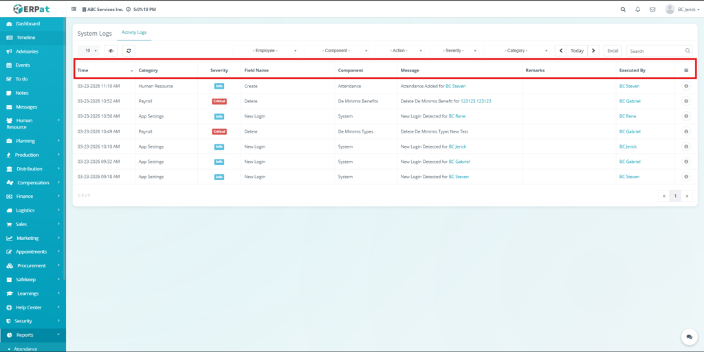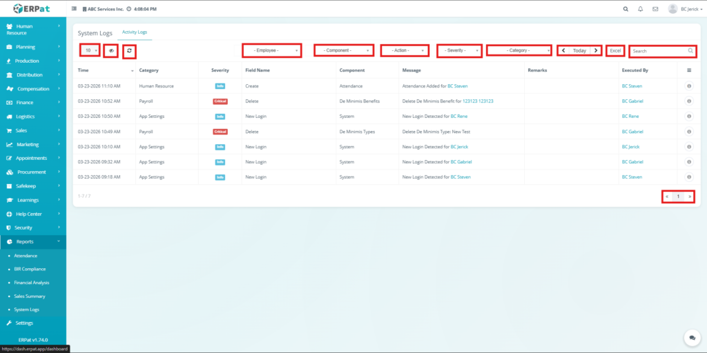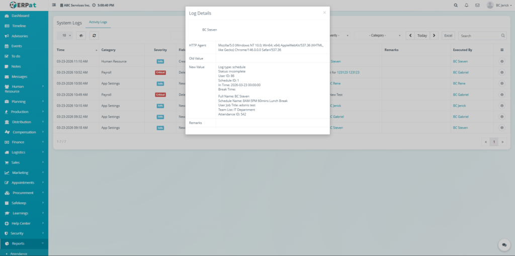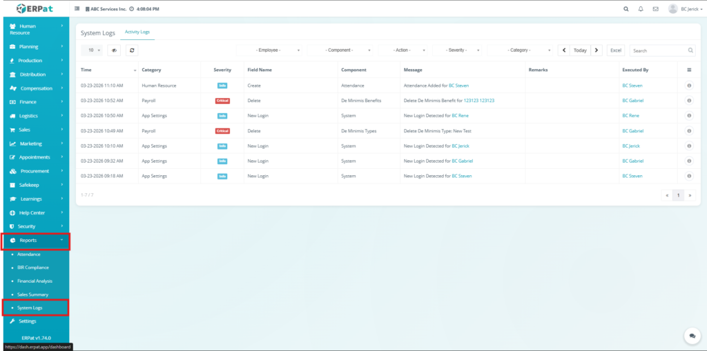 The System Logs Module is used to track and monitor all system-generated activities within the ERPat system. It provides a centralized record of user actions, system events, and module interactions for auditing, troubleshooting, and security purposes.