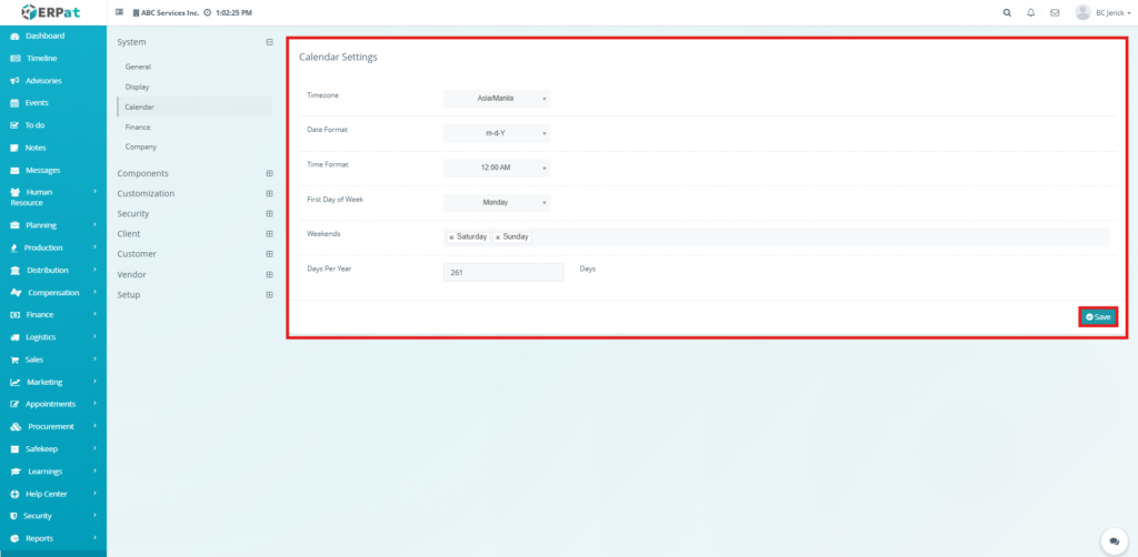 The Calendar Tab is used to configure date, time, and scheduling preferences within the ERPat system. These settings affect attendance, scheduling, and reporting modules.