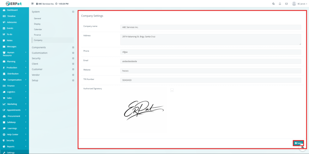 The Company Tab is used to manage company-related information within the ERPat system. This includes business details, contact information, and authorized signatory configuration.