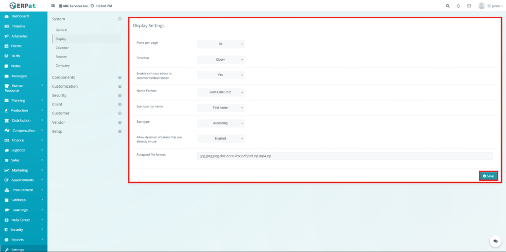 The Display Tab is used to control how data and interface elements are presented throughout the ERPat system. It allows administrators to customize viewing preferences and formatting behavior.